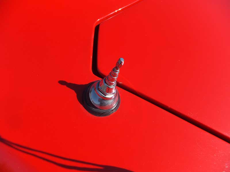 純正色ロッソよりは1段明るい感じのレッドは艶があります。おそらく前オーナーさんのときにリペイントされていると思われます。歴代オーナーさんがガレージ保管、雨天未使用かと思われ、全体的には良好な外装状態ですが、劣化しやすい赤系色のせいか、経年劣化により残念ながら塗装の割れや浮きが所々に見られてきています。