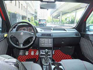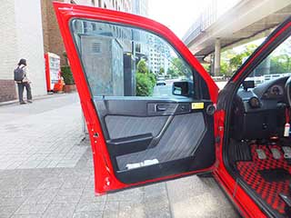 純正色のレッドの外装は綺麗な状態を維持されており、エンブレム類等含め光沢を放っています。外装はオリジナル色で過去に一度同色リペイントをされており現在も綺麗な状態を維持されています。前オーナーさんがつけていた大型リヤスポイラーを外してその後を綺麗にスムージングしてスッキリとしたウイングレス仕様を実現しています。バンパーは前後とも樹脂の部分も含めてボディ同色塗装され、フロントリップスポイラーも外してあり、フロント廻りもよりスッキリとしたデザインになっています。左側サイドスカート端にごく小さな塗装のワレが確認できた以外キズヘコミ等は一切確認できません。とても25年以上を経過しているとは思えない綺麗さを維持されています。
