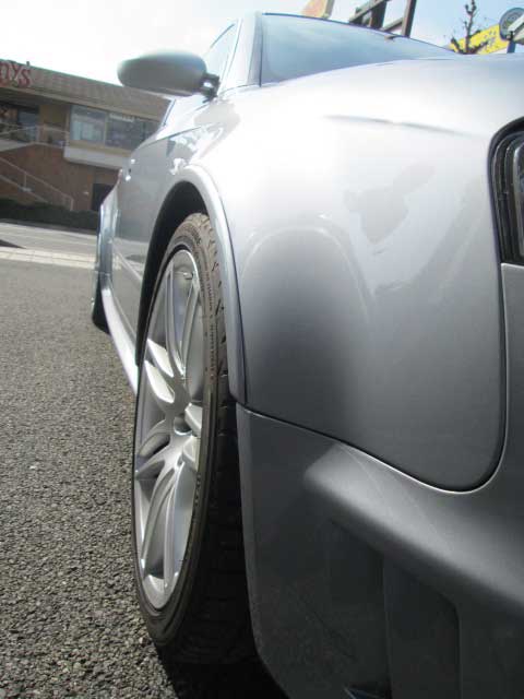 ベースは「S4」ですが、より高い次元のハンドリングと高速安定性を目指してタイヤサイズを含むトレッドを広げた結果、よりワイドなフェンダーフレアとなったのが「RS4」最大の外観上の特徴。