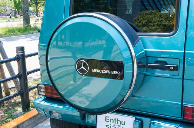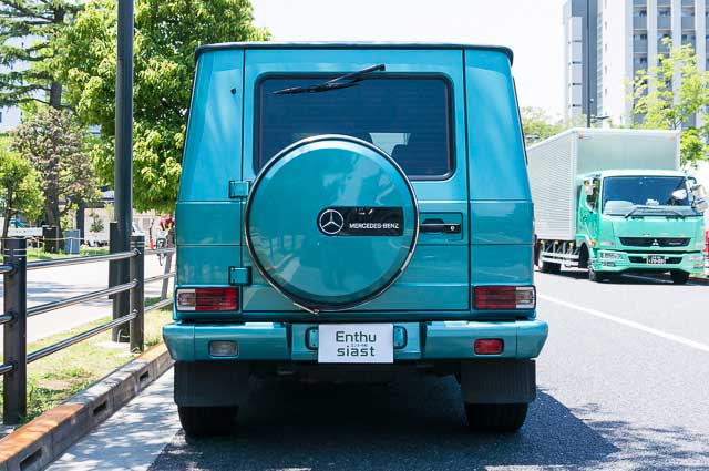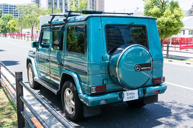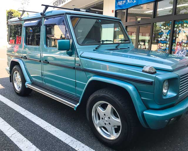 | 大変希少なボディカラーを持つ、程度良好なGクラスです。 メルセデスベンツが誇る正統派オフローダーであり高級SUVでもあるGクラス(ゲレンデヴァーゲン)。 基本部分に大幅な変更のないままエンジンの大排気量化、インテリアや装備の高級化が進み現在に至りますが、こちらのお車は1994年式で、初代GクラスたるW460から2代目のW463にモデルチェンジして4年後の車で、1995年(H7)1月に3.2リッターDOHCのG320にマイナーチェンジされる直前のモデルになります。 1990〜94年(H2〜6)までは基本的に300GEと呼ばれていましたが、94年の後期にのみG300という呼称のモデルが存在し、内容的にはエンジンが3リッターSOHCのまま内外装がマイチェン後のG320と同様になります。 このM103型・3リッター直6のSOHCエンジンはフィーリングの良さと信頼性の高さが有名で、その名エンジンをマイチェン後の内外装で愉しめるのがこのG300のポイントです。 加えて、Gクラスはもちろん通常のメルセデスでもまずお目に掛かれない、ベリルという宝石から名付けられた何とも美しい淡い青緑メタリックのボディカラーが、このお車の最大の特徴になります。 ●● プロフィール ●● 幼い頃から車に馴染み深い環境で育った根っからのエンスージアストで、現在もキャデラックエルドラドやBMW6シリーズ、スマートブラバス等も所有しているオーナーさんが、インテリア関係のお仕事で使うためにこちらのG300Lを購入したのは2013年(H25)4月のことでした。 興味深いのは、こちらのお車はGクラスとしては2台目の購入であり、より理想に近いGクラスが見つかったから買い換えたというエピソードです。 気に入っている点は、家具等を入れるためラゲッジが広いこと、幅がほどほどなためパーキングで困らないこと、いざとなったら7人乗れること、そして何と言ってもベリルというカラーとのことでした。 普段は屋根付きスペースにて保管し、メンテナンスはディーラーとGクラス専門店を適宜使い分けています。 当初お仕事と時折レジャーに使っていましたが、現在はさらに仕事用としてバンを増車したためお仕事に使うことはほとんどなく、日常の足にはスマートを、遠出の時には6シリーズを使うので、最近ではほとんど出番がなくなってしまったとのことでした。 ●● 外装 ●● ベリルに塗られたボディは23年もの時を経てなお程度良好です。 さすがに飛び石的な塗装剥げやごく小さいスリキズといった小キズは散見されますが、大きなキズやヘコミはありません。 ホイールもガリキズが若干ある程度でキレイですし、エンブレムや灯火類もキレイさが保たれています。 不調箇所としては、フォグランプが時折点かないことがあるのと、左ウインカーのベース部にある割れをビニールテープで補修していることが挙げられますが、その補修部分は言われないとわからないくらい自然です。 ●● 内装 ●● '90年代前半のメルセデス独特の、ウッドパネルが設えられ上質感がありつつ実質重視で直線的なインテリアに、ファブリックシートが組み合わされています。 Gクラスに限らずメルセデスというとレザーシートが人気ですが、このファブリックのシートとドア内張りは高ポイントと言え、レザーより痛みにくいため年数が経っても美観を保ちやすく、色柄も上品なため、ともすればオラオラ系になりがちなGクラスに品の良さを与えています。 ファブリック内装がキレイさを保っているのと同様、レザーの巻かれていないステアリングやシフトレバー、サイドブレーキレバーも良い状態が保たれています。 内装で最も大きな瑕疵は、センターコンソールのウッドパネル、パワーウィンドウスイッチ周辺にあるクラックですが、気になるのはそことリアシート右側の座面に薄い染みがある点くらいで、運転席の足元など23年11万キロ経ったとは思えないくらい良好、家具等を運んでいたというエピソードもにわかに信じられないほどラゲッジも良好です。 リアの5面にはスモークフィルムが貼られていることも有効なのか、内装の経年劣化はごく少なめに抑えられています。 エアコンその他電装品はほとんどOKですが、数少ない不調箇所としては、サンルーフが不動な点が挙げられます。 インテリアの雰囲気を壊したくないとのことでナビも装着しておらず、オーディオも希少な当時の純正デッキ(Technics)のままです。 ●● 機関・脚廻り ●● 名機との呼び声も高いM103型エンジンはフルノーマルでモディファイ箇所はありません。 ただ、M103型の長所としてはスムーズさと頑丈さのみならず、後継の3.2リッターDOHCのM104型と比較して熱量がずっと少ないという点も挙げられますので、年式が進むほどにエンジンルーム内のゴムパーツやワイヤーハーネスといったパーツの劣化がしにくいといったメリットにつながりますし、シンプルなOHCヘッドの恩恵で整備性が良く、ひいては整備コストが少なく済む傾向にあります。 そのほかは、ウォッシャータンク劣化のため、ウォッシャー