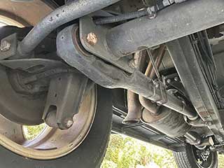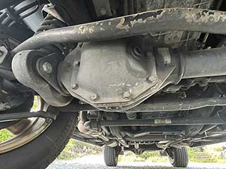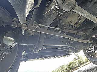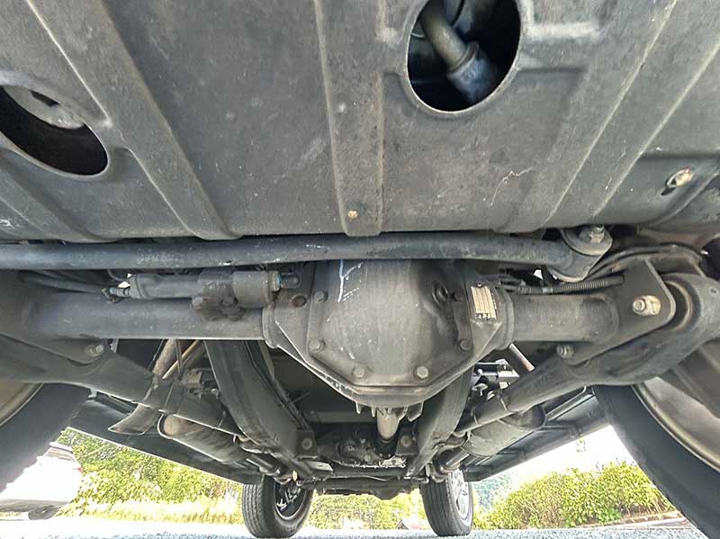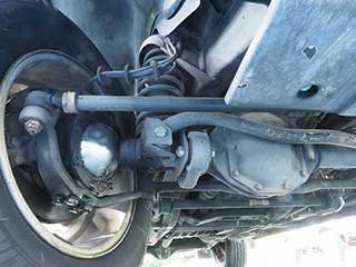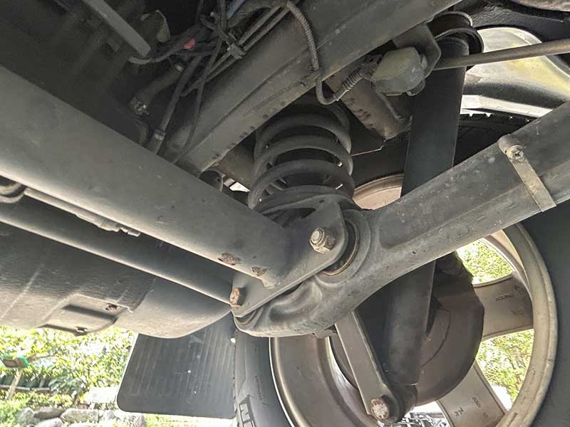 コイルスプリングとリジッドアクスルの構造がしっかりと残っており、アーム類、リンクやブッシュ類に目立った破損や欠落は見られません。