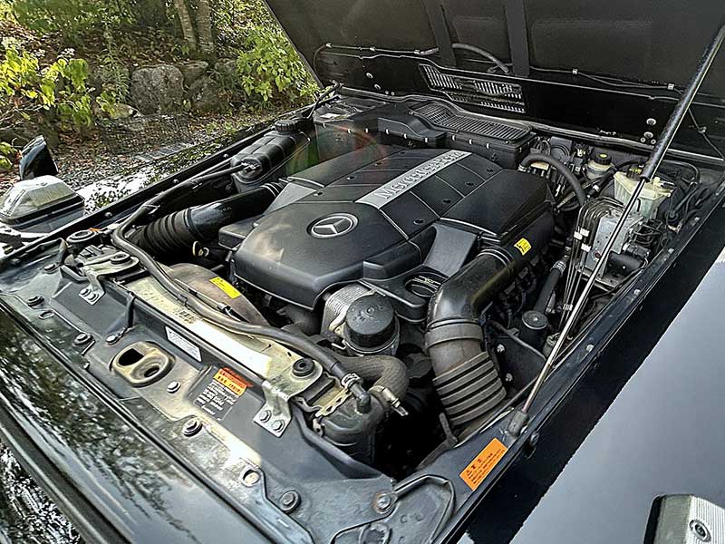 吸気系配管やホース、電装配線類、補機類ともきれいな状態で、経年車としては非常に良好な印象を与えるエンジンルームです。