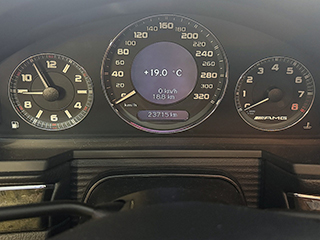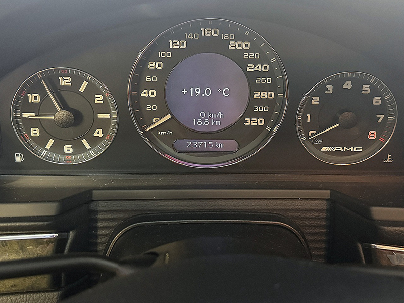 中央にフルスケール320のスピードメーター、左に時計、右にタコメーターが配された情報がぱっと一目でわかるメーターパネルです。走行距離はメーター読みで23,715km |