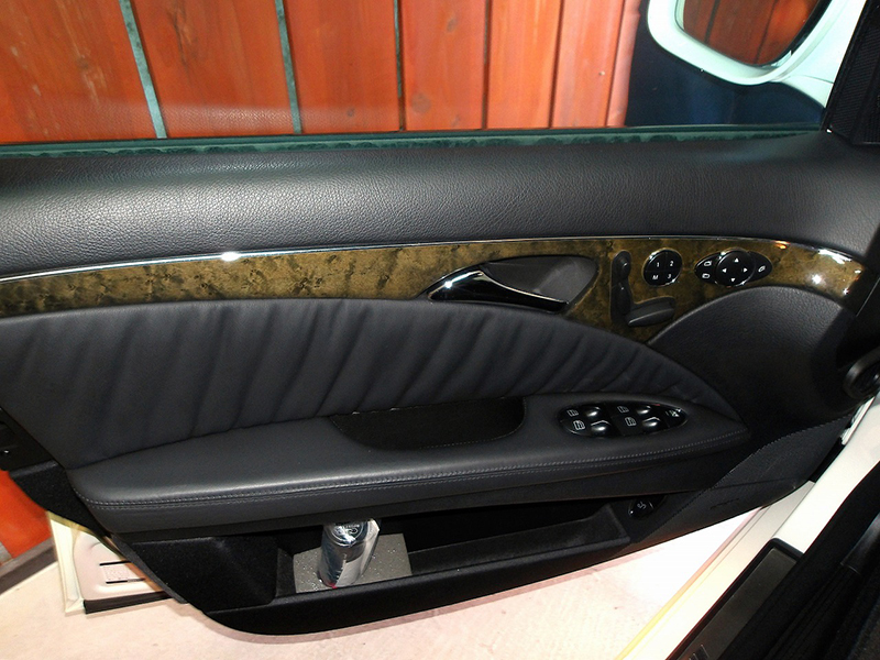 運転席側ドアライニングの様子、皮革部分、ウッドパネルともにきれいな状態です |