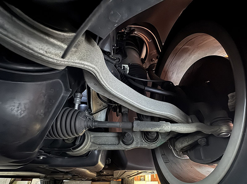 前から見るフロントサスペンション、アーム類、ブッシュ類、リンク類、オイルライン等すべてが整備されてきれいな状態です。 |