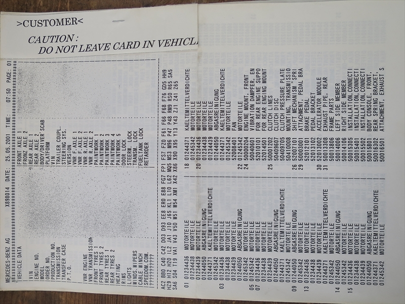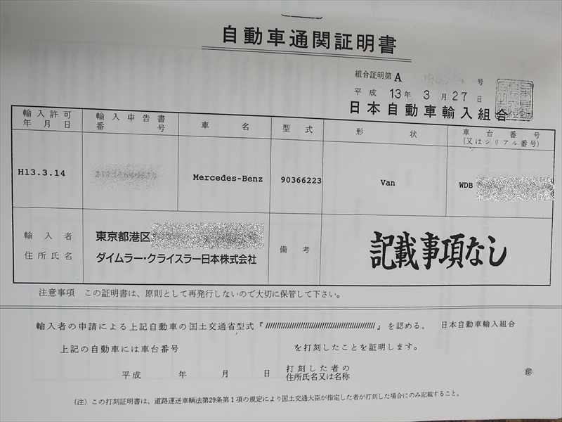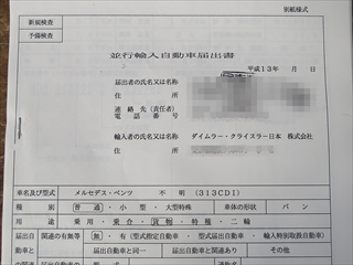 ※車検証の型式は不明となっていますが、輸入者名としてダイムラー・クライスラー日本が記載された並行輸入自動車届出書(通関証明書/車両諸元概要表)、また整備や部品の発注に必要なオーダーナンバーやプロダクションナンバー等が記載されたビークルデータシートもございます。