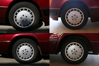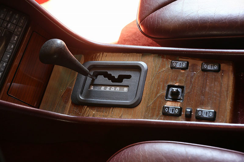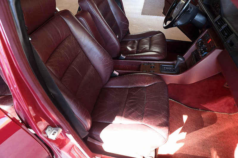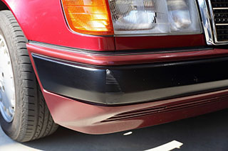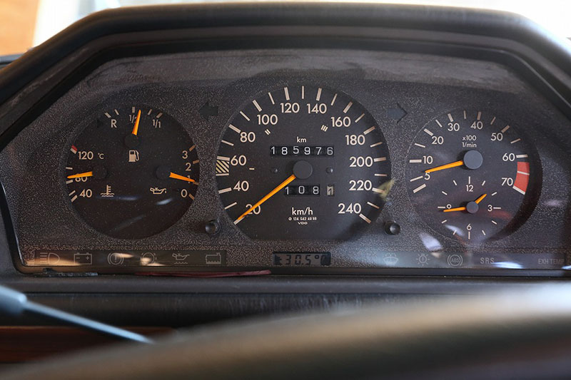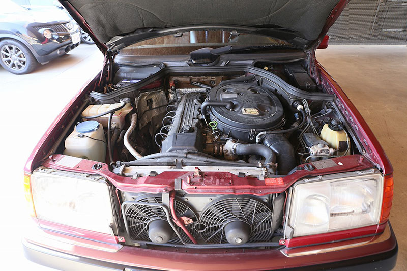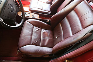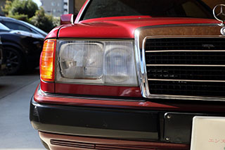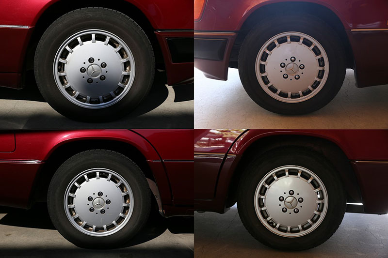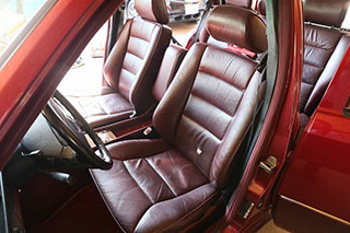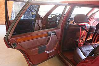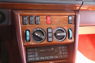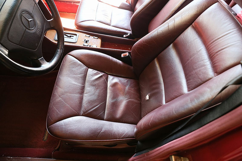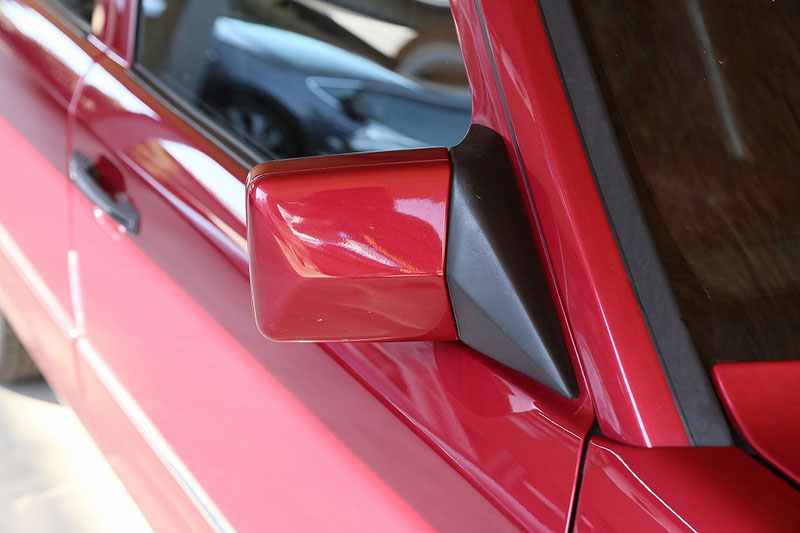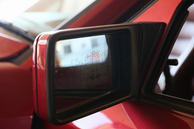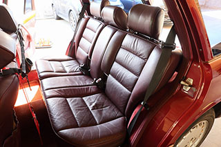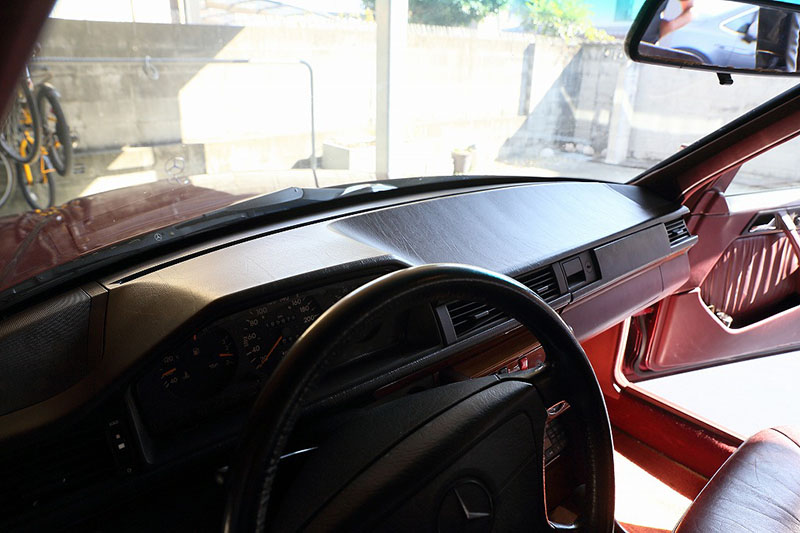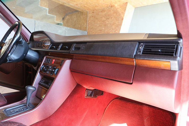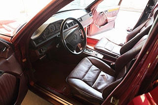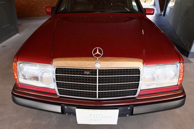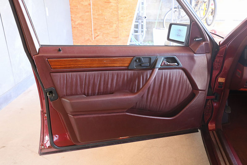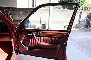 メルセデスならではの高品質な塗装に加え、保管状態が良かったものと思われますが、希少なアルマンダインレッドのボディは30年以上前の車だと思えないほどに綺麗で艶があります。アルマンダインレッドをわかりやすく言えばワインレッドメタリックと言っても良い色になります、メタリックの粒子が細かく、赤ワインのようなとても綺麗な色です。