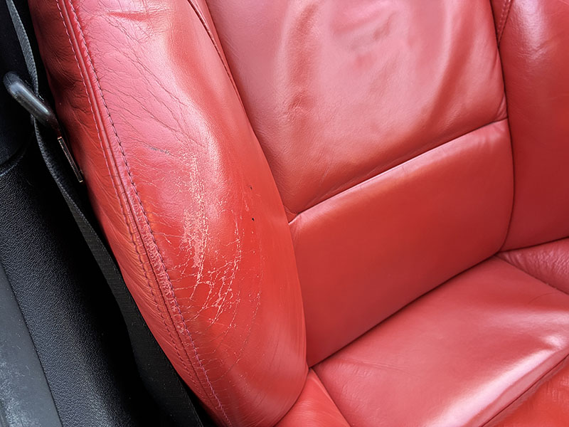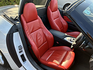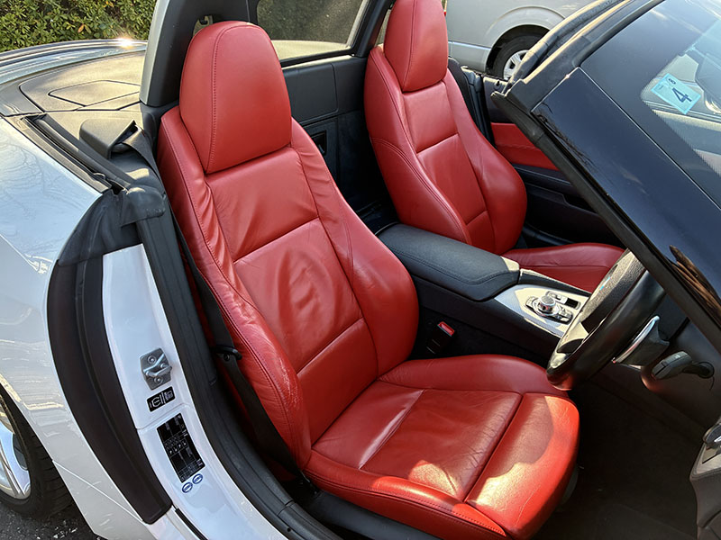 内装はフルノーマルで、赤の革シートがボディーカラーとマッチしていて、とてもオシャレで、オープンにした際はさらに映えます。