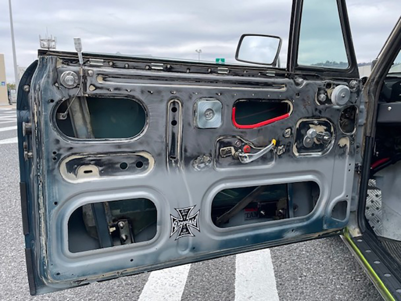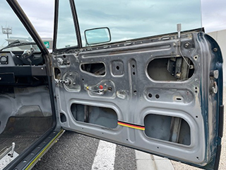 内張レスの左ドア内、上部の赤いゴム質の部分はドアの開閉時に掴むグリップ |