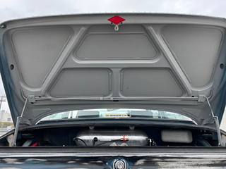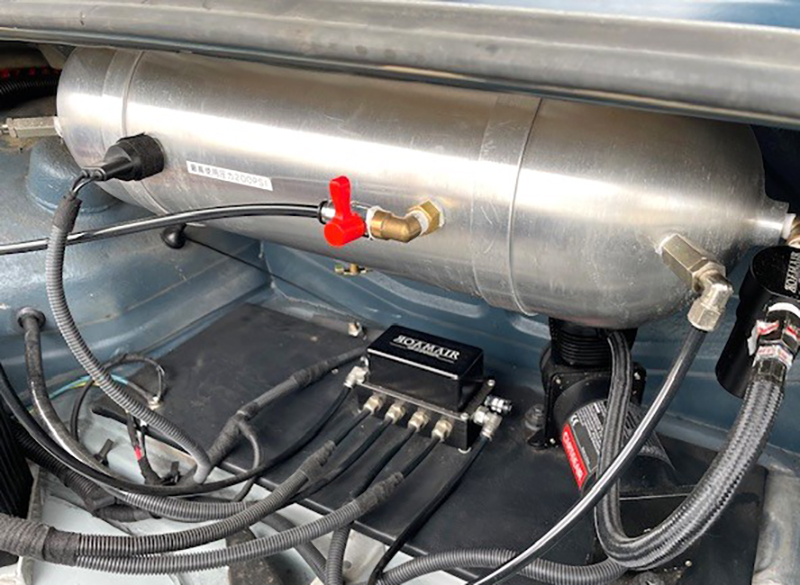 トランク内には、純正ガソリンタンク、エアサスのコンプレッサー、アルミタンク、バッテリーは2機掛け |