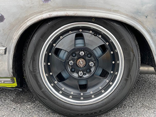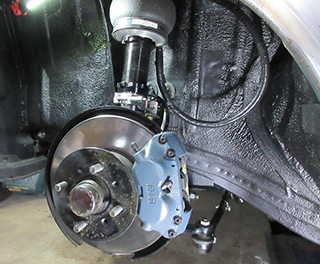 フロントデイスクにエアサスが見える。ブレーキラインは一新 メッシュホース、ローター、キャリパーASSY新品交換済み、ブースター及びマスターは日本車旧車用の新品交換済み |