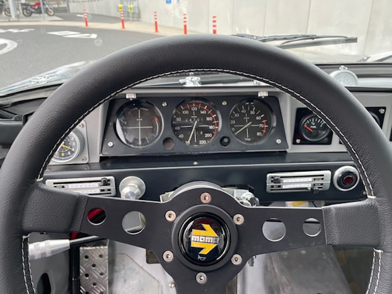 運転席に座った景色、純正3連メーター、ステアリングはモモ |