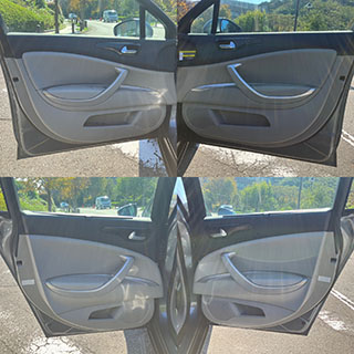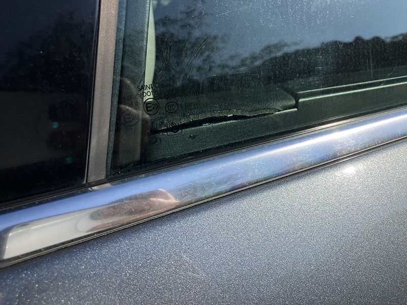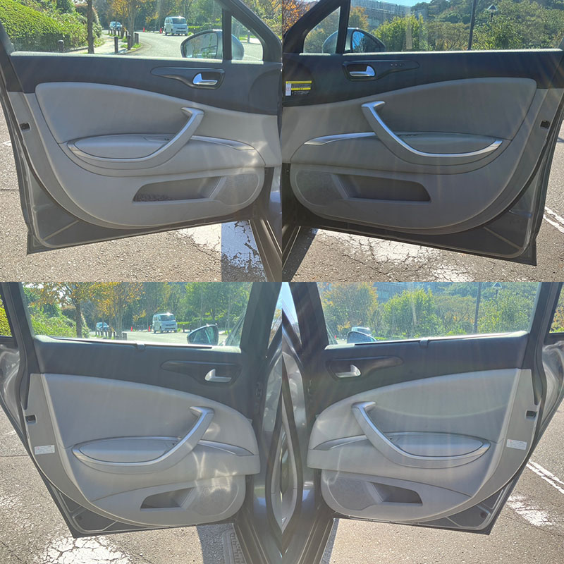 左後席ドアのトリムに、経年劣化による一部浮きが見られますが、トリムを取り外せば修復可能なレベルかと思います。