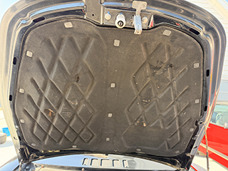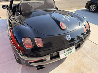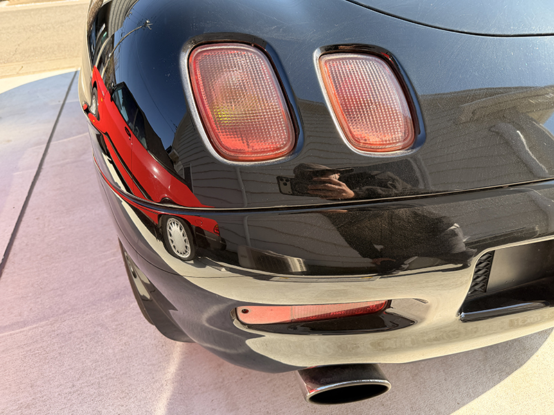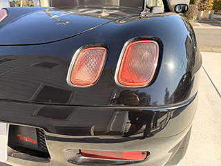 一般的にイタ車の塗装は劣化に弱い傾向があります。この車両もやはりリアトランクにレッドブルの様な形状でクリアハゲ箇所があります。