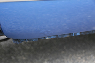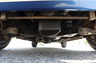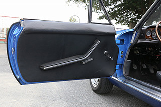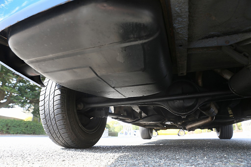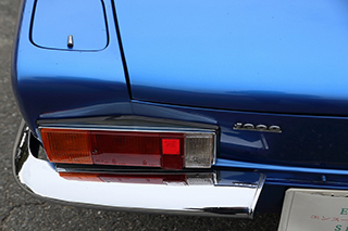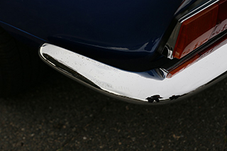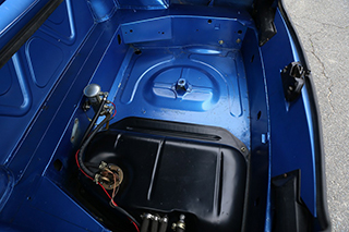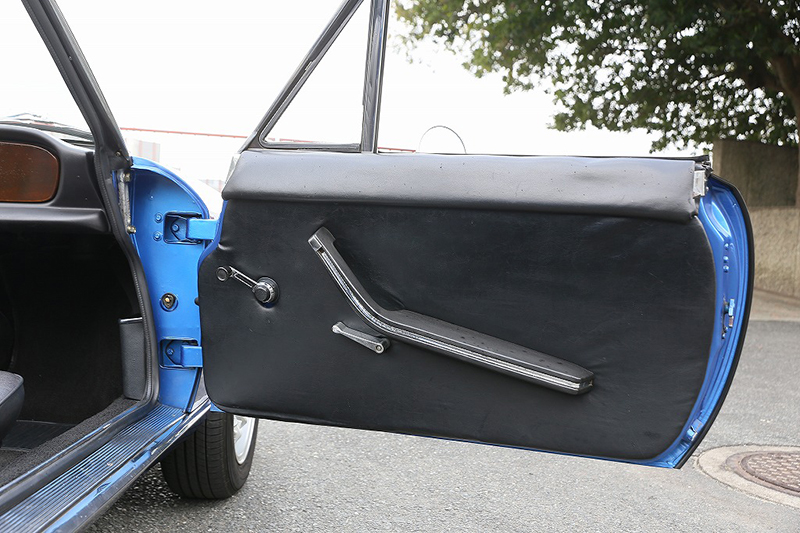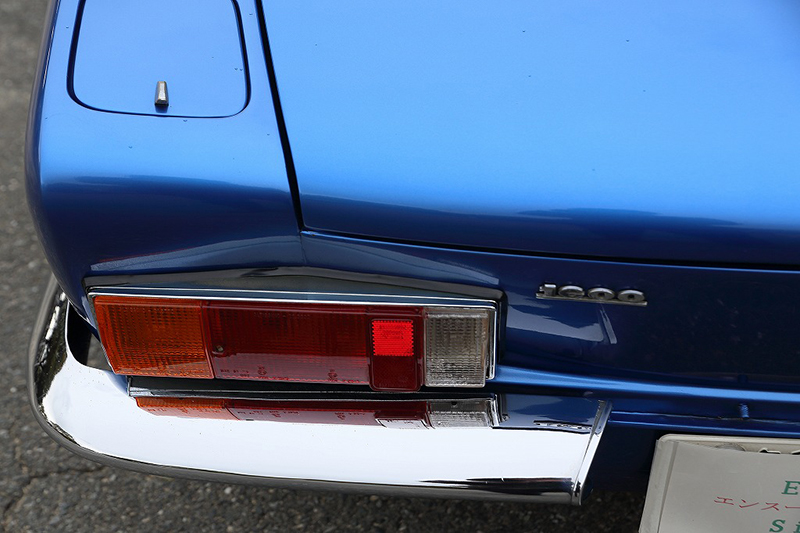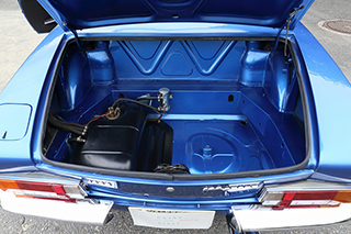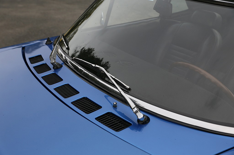 ブルーメタリックのボディはオリジナルのラッカー塗装を剥離し、ウレタン塗装をしています。塗装の状態は全体的に綺麗で擦り傷、凹み、飛び石傷などはっきりわかるようなものはありません。一点のみ、左後方バンパー下部付近に小さな塗装の膨れが見受けられました。位置的にも目立つものではありませんが、詳細は掲載写真をご確認ください。