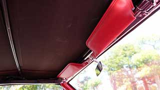 【内装】 シート、ドアパネルもすべて赤色内装、フルトップを全開にしたとき、鮮やかな赤が、アメリカの古き良き時代を彷彿させてくれました。やはりこの車はフルオープンで、高原や海岸線を燦燦と走っていく姿がとても似合いそうです。ソフトトップの開閉箇所の小傷を除き、とても奇麗でした。