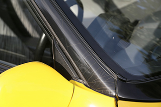しいて欠点を挙げるとすればフロントバンパーに飛び石傷をタッチアップしたと思われるものが2か所、ドアミラーに少し擦れ(磨けば消える程度)、それからAピラーには塗装ではなく黒いシールが貼られているのですが、経年劣化でヒビが出ています。これはどのビートでも生じているものですが、ヒビの程度は少ないほうです。