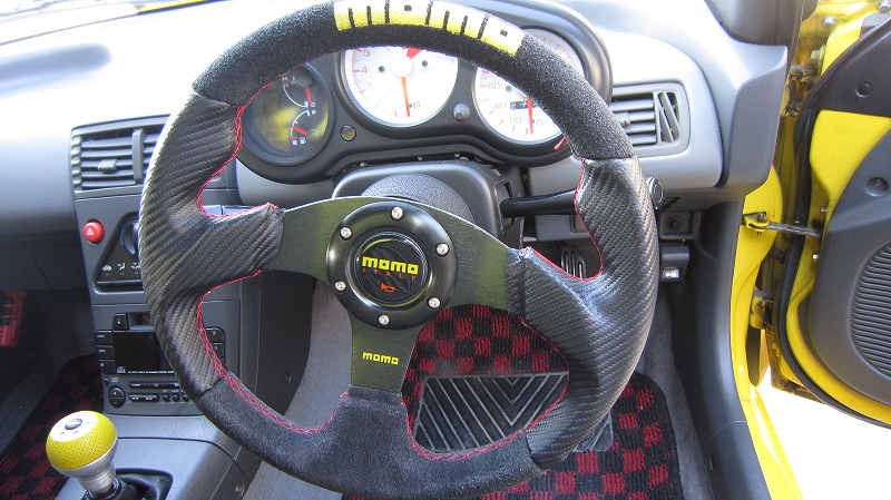 シフトノブ、ステアリングはモモ。カロのフロアマット
