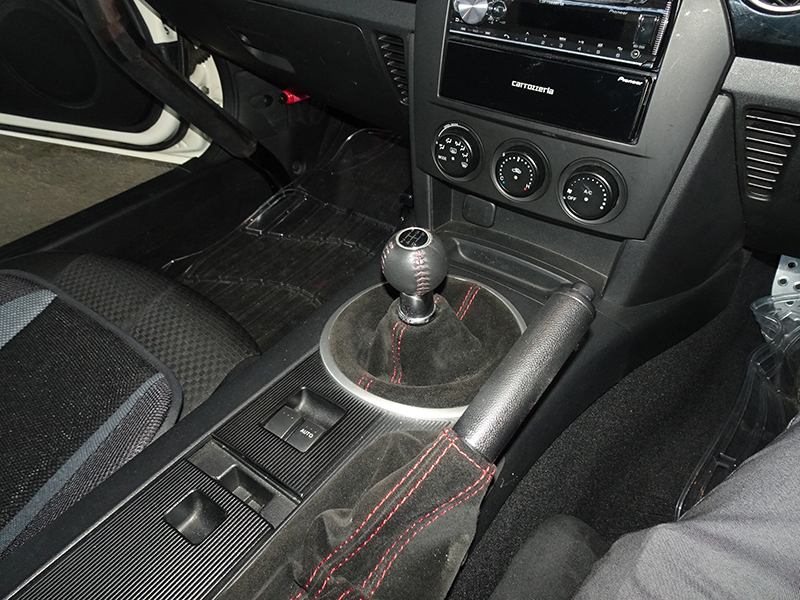 ステアリングホイールはバックスキン、シフトノブは本革、シフトレバーカバーとパーキングブレーキカバーには赤のステッチがあり、スポーツカーだなと感じさせます。