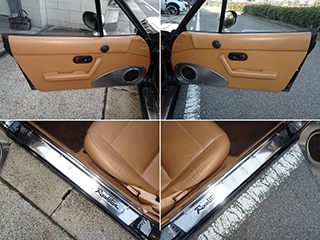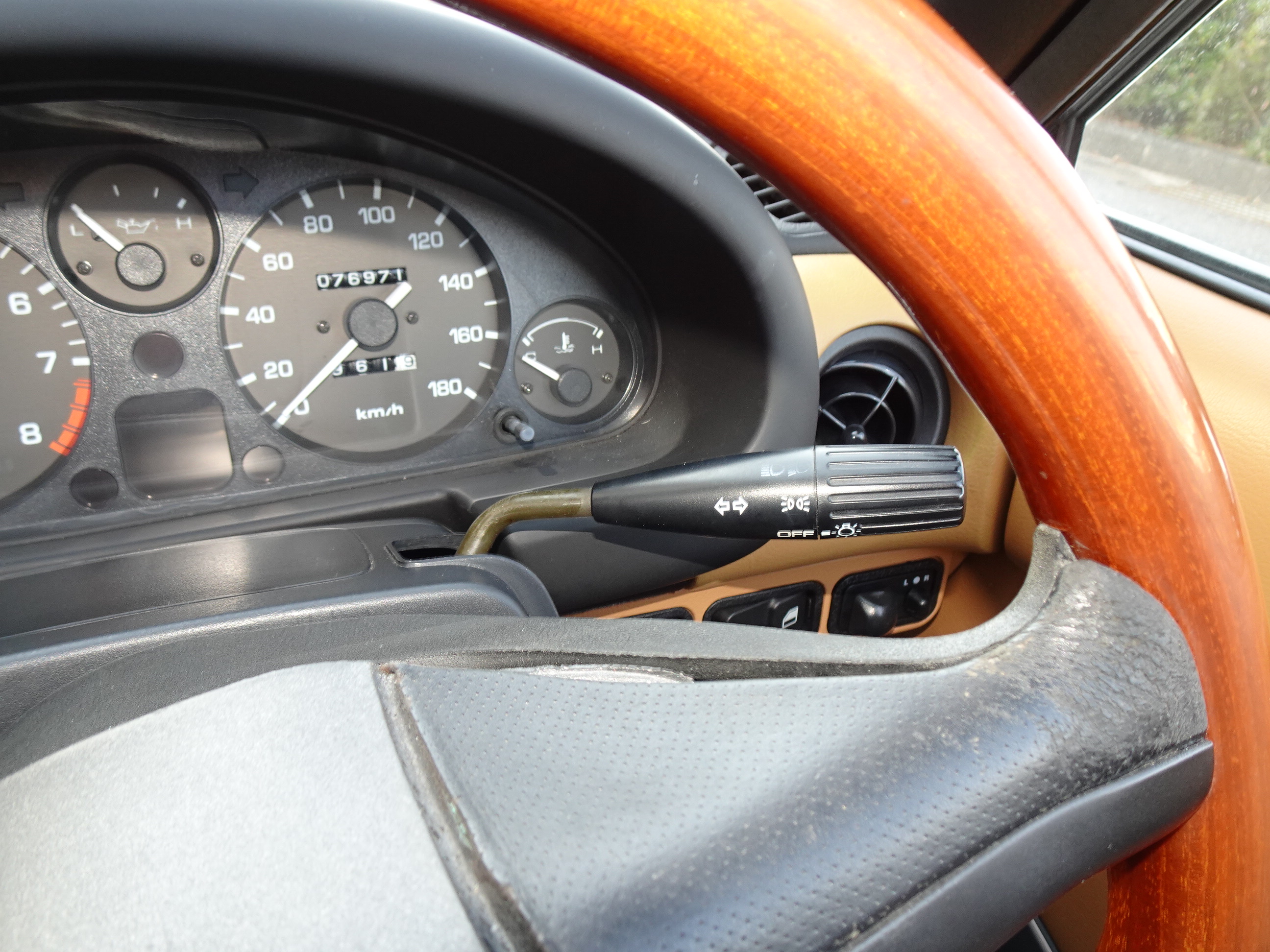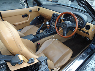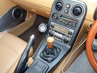タン色の本革シート、ナルディ製のウッドステアリングホイール、ナルディ製のウッドシフトコントロールノブなど、イギリス車を連想させます。