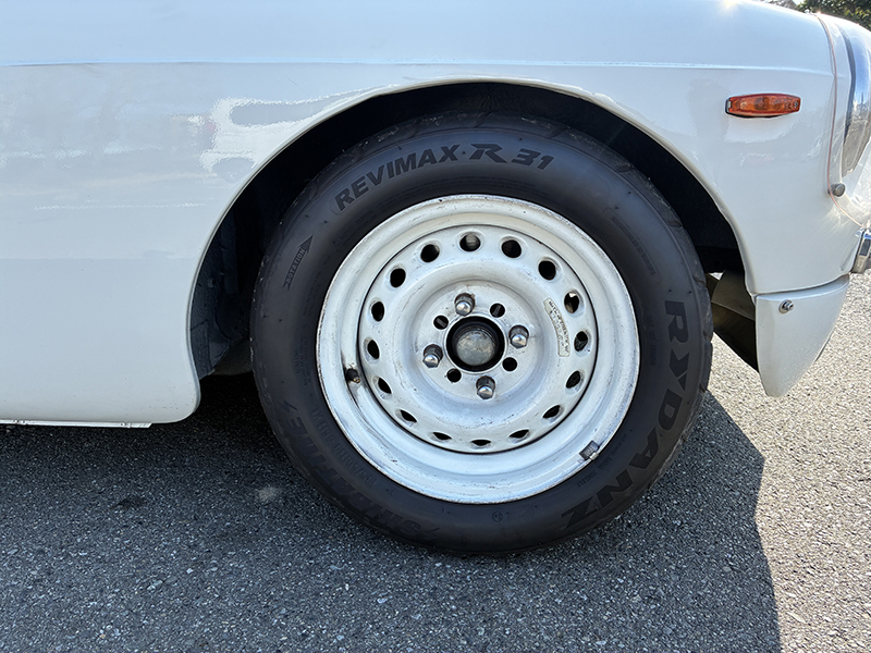 アルミホイールはスーパーラップの14インチ。 タイヤは「SHIBATAIRE」REVIMAX R31の185/60R14。 2024年の15週目製造で、山は充分に残っています。