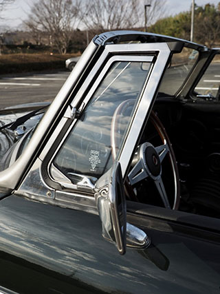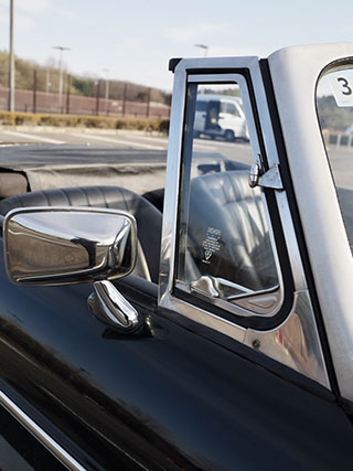 クラシックなクロームドアミラーと三角窓まわりの美しいメッキパーツ |