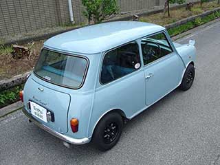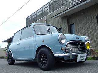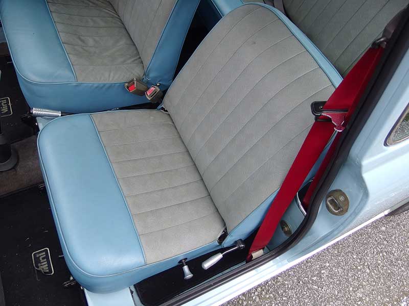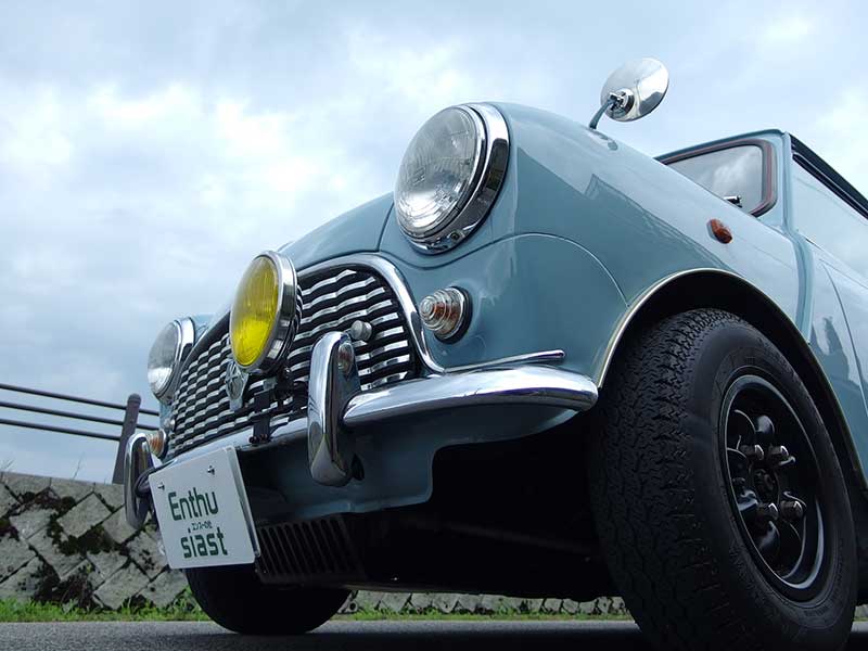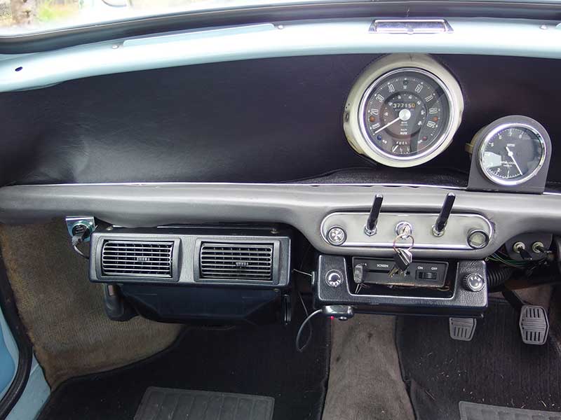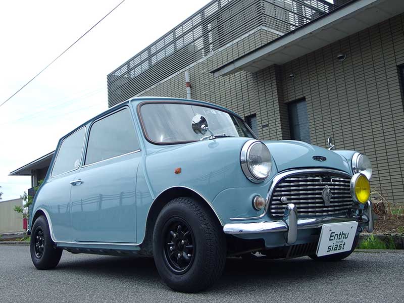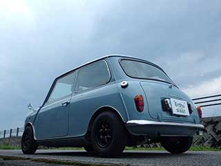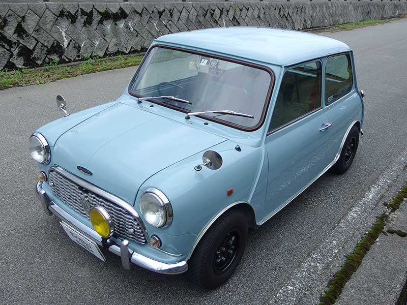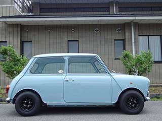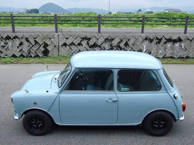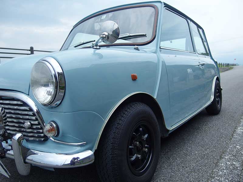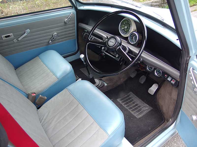 ペールブルーのボディにベージュとブルーのインテリア。シートベルトの赤色が差し色になってミニのMk−1仕様の中でも、かなりセンス良くまとまった一台です。SUツインキャブの1000ccエンジンは実用域での扱いやすさもあり、普段乗りのメインにできるクラシックミニ。見るだけ乗るだけで毎日笑顔になるパートナーになり得る車です。