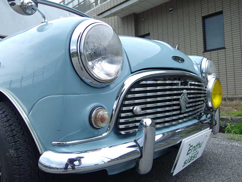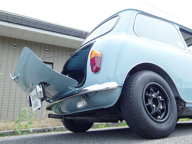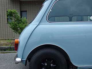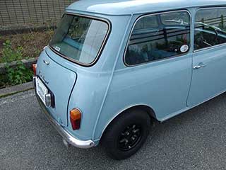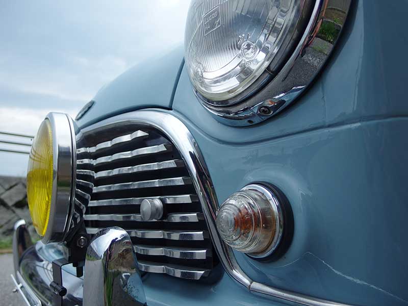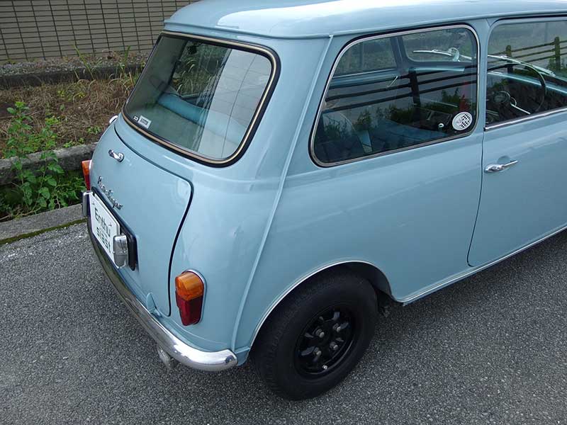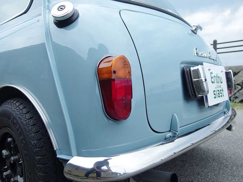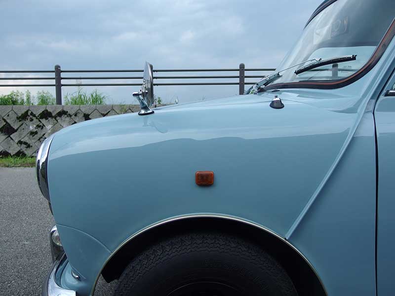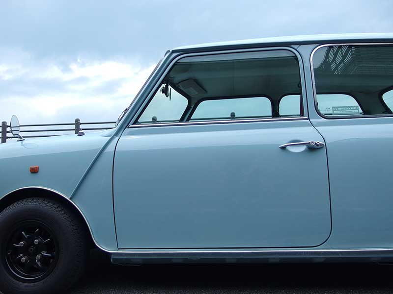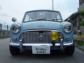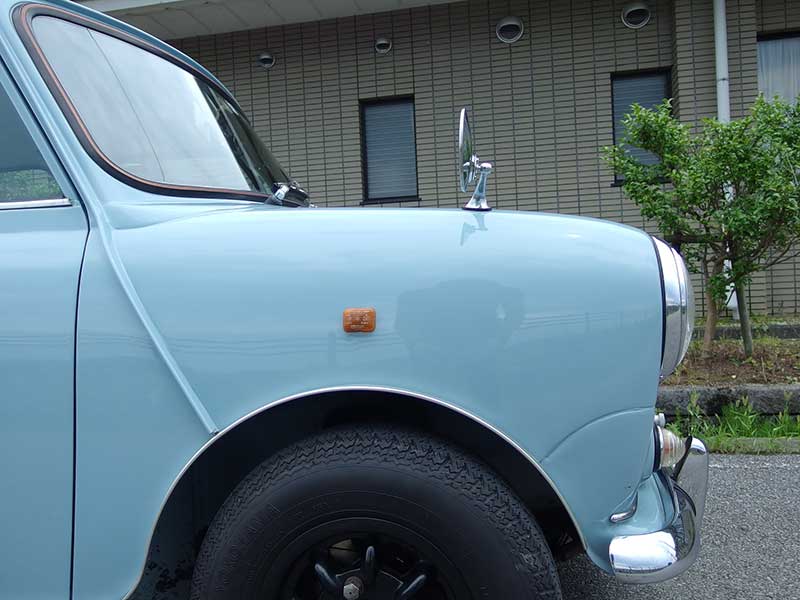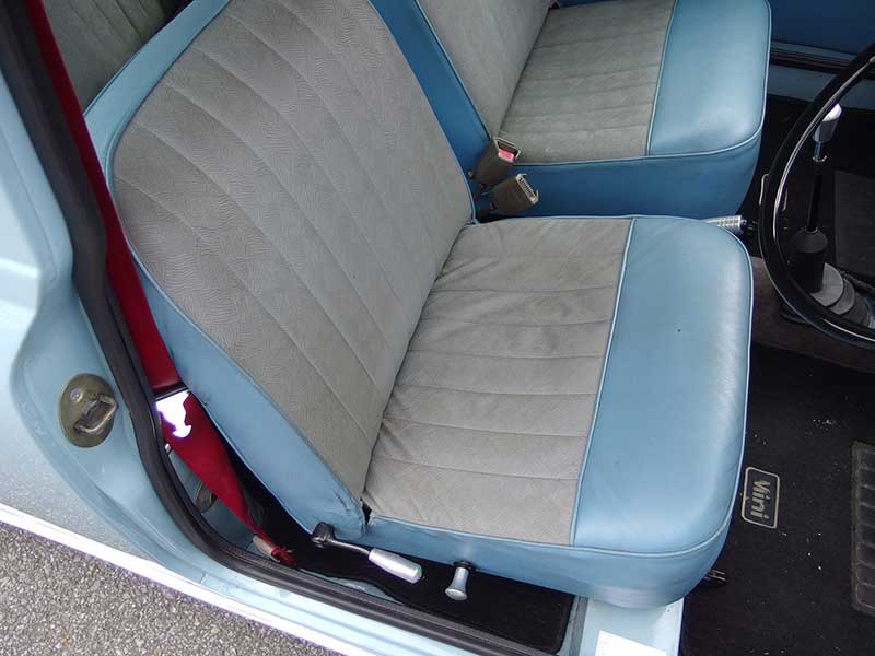 ペールブルーのボディにベージュとブルーのインテリア。シートベルトの赤色が差し色になってミニのMk−1仕様の中でも、かなりセンス良くまとまった一台です。SUツインキャブの1000ccエンジンは実用域での扱いやすさもあり、普段乗りのメインにできるクラシックミニ。見るだけ乗るだけで毎日笑顔になるパートナーになり得る車です。