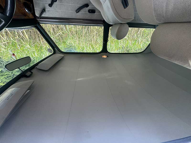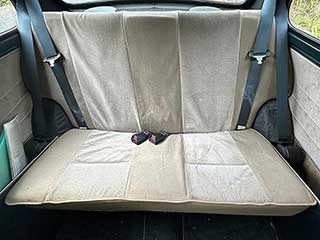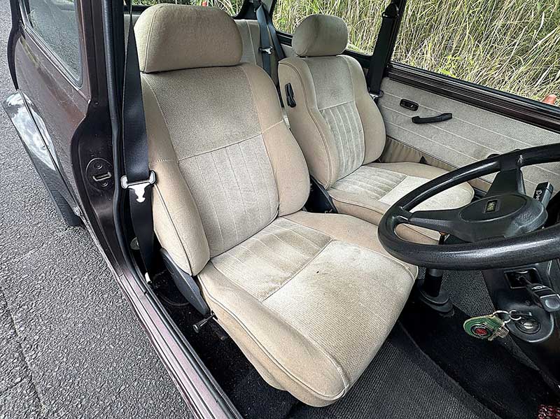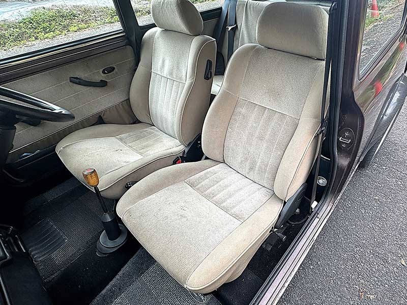 ベージュとグレーを基調としたファブリック×ビニールのコンビシートは、英国車らしいクラシカルな柔らかさ。
