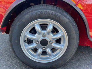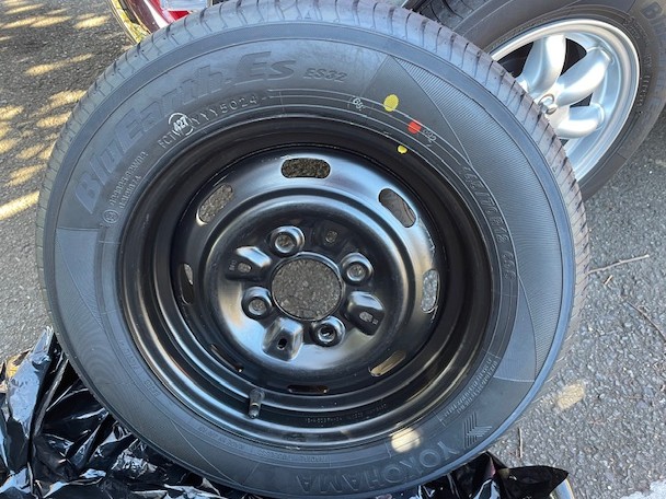 純正アルミホイール 4本共に傷無し タイヤは145/70/12 ヨコハマ ブルーアース。敢えて国産タイヤを選ぶあたりは安全志向のオーナーさまのチョイス |