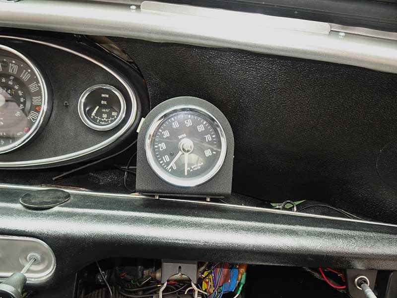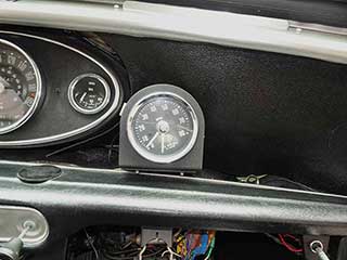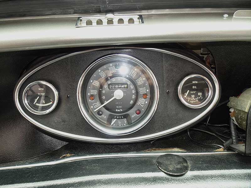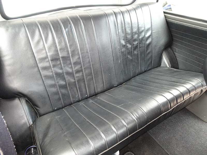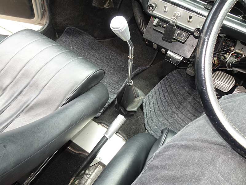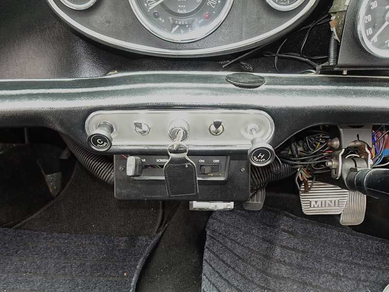 クラシック・ミニの定番であるセンターメーター、スミス製のタコメーター、ジョンクーパーのステアリングホイール、コブラシートなどが装備されています。