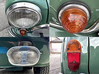 左上:CIBIEのW反射ヘッドライト、Mk1特有の“ピン固定式ヘッドライトリム”。レンズは曇りなくきれいな状態です。 左下:バックランプ 右上:ウィンカーレンズの状態 右下:リアコンビネーションランプ、止めネジも大変きれいな状態です。 |
