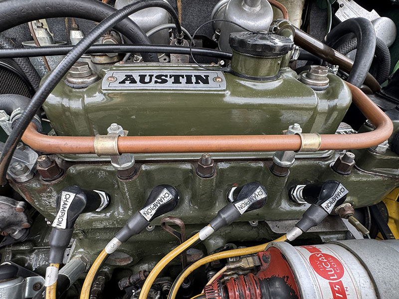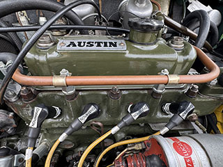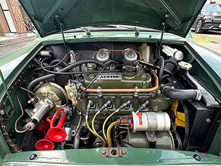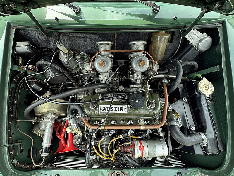 ヘッドカバーは手入れの行き届いた「工芸品」を思わせるような状態です。吸気系はツインキャブレター、LUCAS製イグニッションコイル、その他補器類、コンパクトなエンジンルームに大変きれいにレイアウトされています。 |