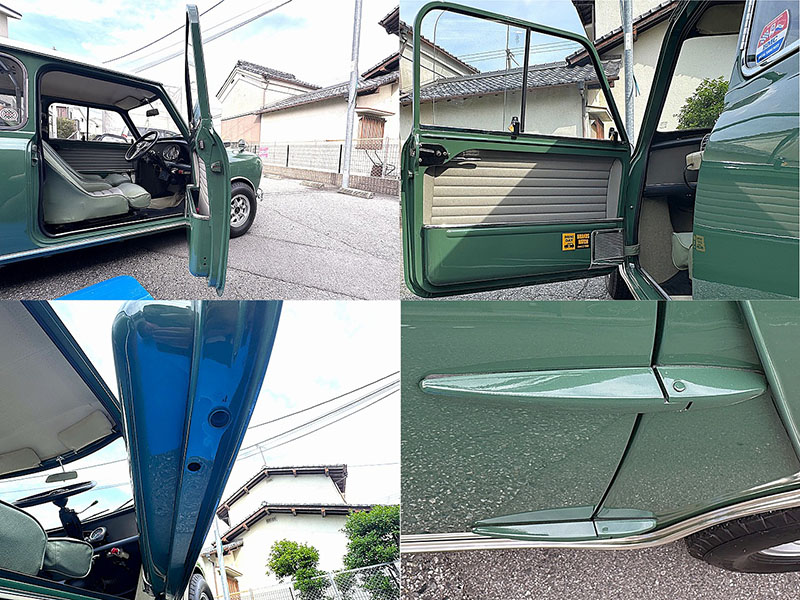 左上:運転席側ドアラッチ部の様子 左下:運転席側ドア下回りの様子 右上:助手席側ドアライニングの様子、運転席側ドアも同様の状態です。 右下:Mk1特有のエクスターナル・ドアヒンジです。外観も動作も問題無しです。 |