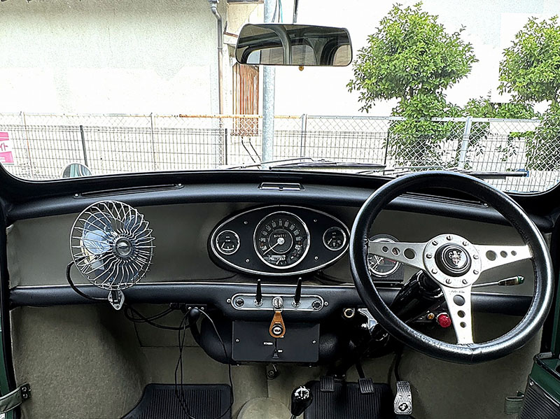 インパネ全景、かなり寝たステアリングがMINIらしさを感じさせます。ファンは暑い時期には必需品です。 |