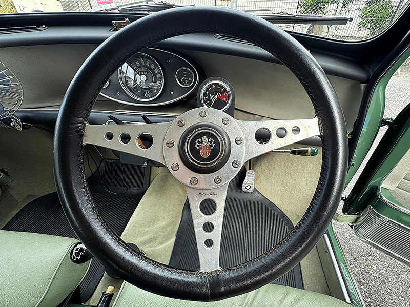 ステアリングは、60年代英国車で定番とされた Moto-Lita製3スポーク・レザーステアリングです。グリップ部は擦れも見られずきれいな状態です。 |