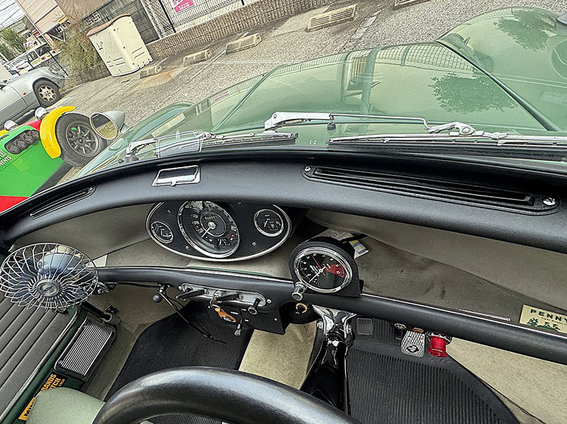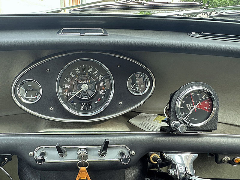 メーターは左から水温計、スピードメーターMPH表示、燃料計、油温計、SMITHS製クロノメトリックタコメーターの配置です。走行距離はメーター読みで92,401ml |
