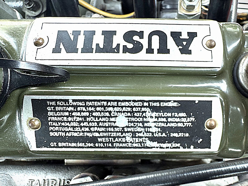 ヘッドカバーのコーションプレートはA型エンジンのシリンダーヘッド技術に関連する特許についてで、16か国における特許になっています。当時のイギリス車が世界中に輸出されていた背景を物語っています。 |
