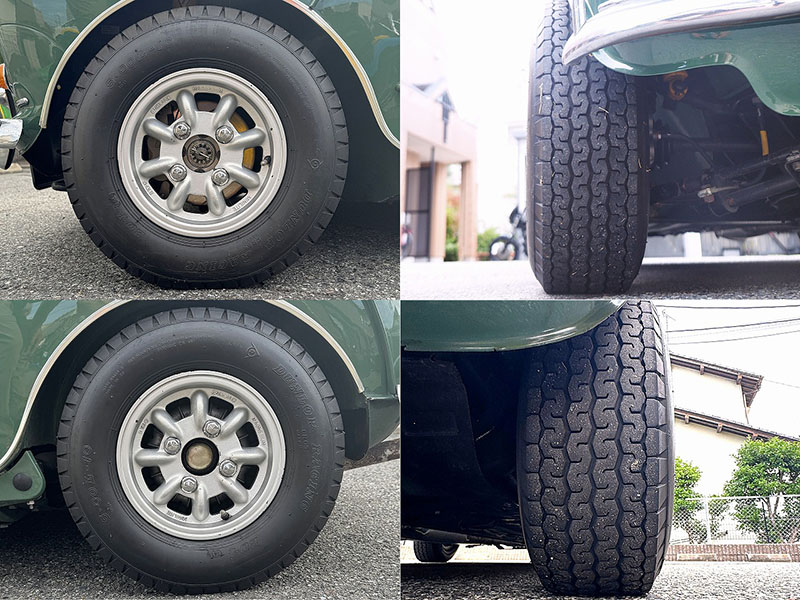 タイヤはDUNLOP RACING 165/60R12 71Hです。2023年第12週製造ですのでまだまだ大丈夫です。ホイールはミニライトマグネシューム 4.5J、ClassicMINIによく似合います。ガリ傷数か所見られます。トレッド面、溝はしっかり残っています。 |