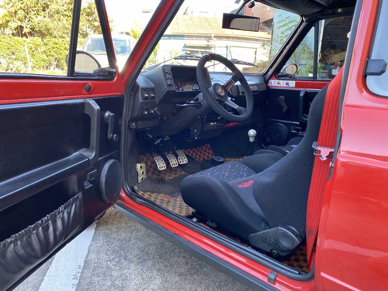 オーバーフェンダーとダックテールはオリジナルです。ホイールはフォーミュラー1のワンオフで作られた物にアバルトのセンターキャップを装着され、タイヤはアドバンネオバが奢られております。
