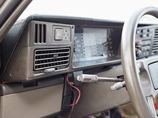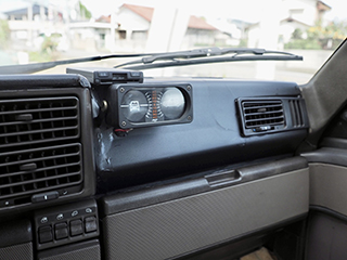グローブボックスは撮影の為固定、普段は外してあり、エアコン吹き出し口が設置できる工夫がある |
