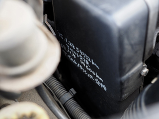 給油口下に樹脂プレートの補修済みクラックが見られる |