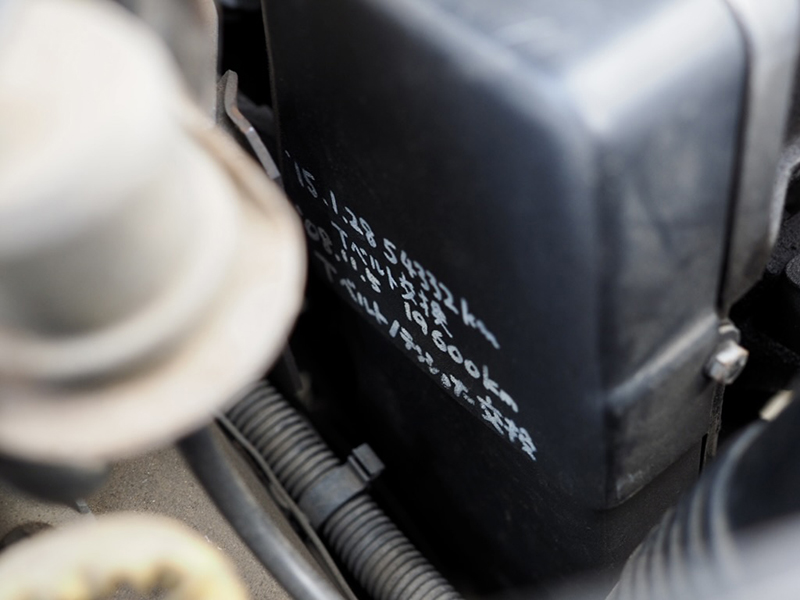 旧オーナー氏により手書きされたメンテナンス記録が刻まれる |