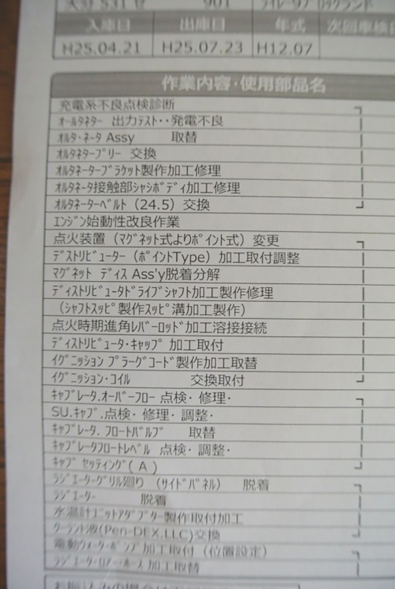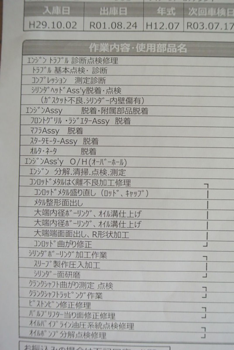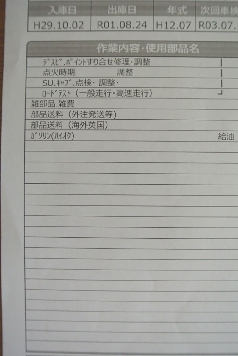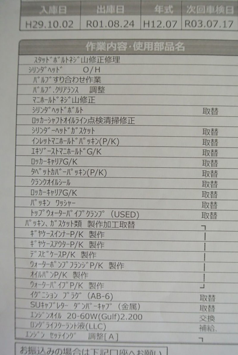 現オーナーが購入後の整備記録は、写真を添付しますので、ご参考にされてください。