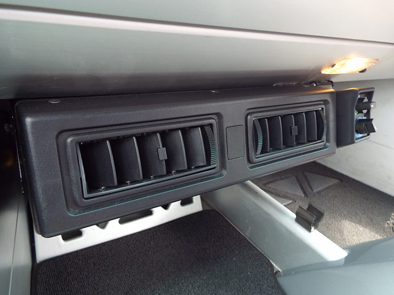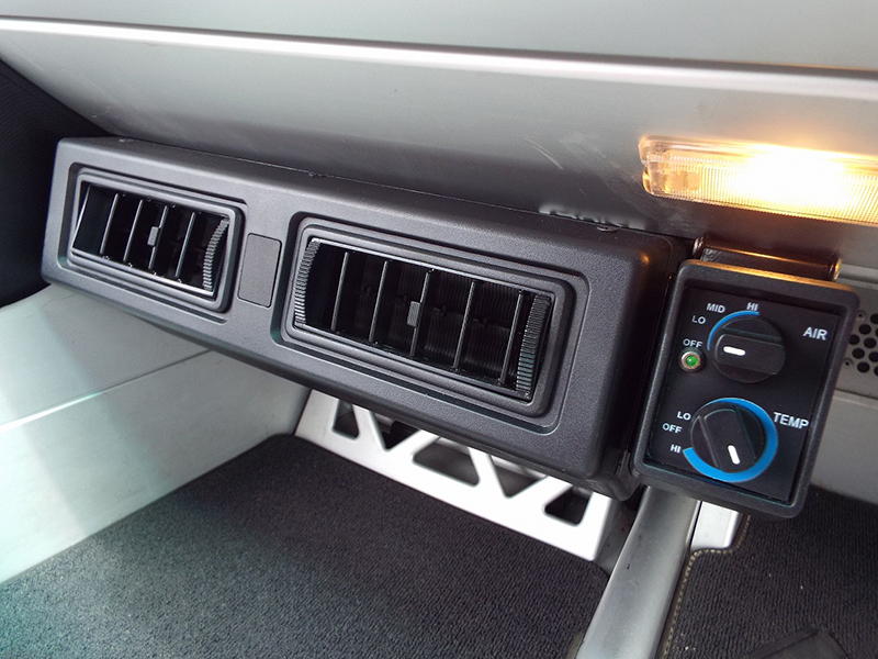 取り付けたクーラーはCRUIZ製のアンダーダッシュタイプ電動コンプレッサー式のクーラーキットです。違和感なく自然に取り付いております。取り付けにかかった費用は部品工賃で50万円ほどかかったそうです。