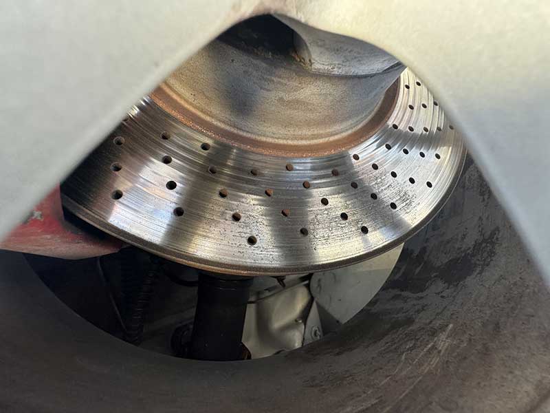 レッドキャリパーが鮮やかで、ドリルドローターの摩耗もわずかです。