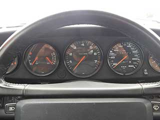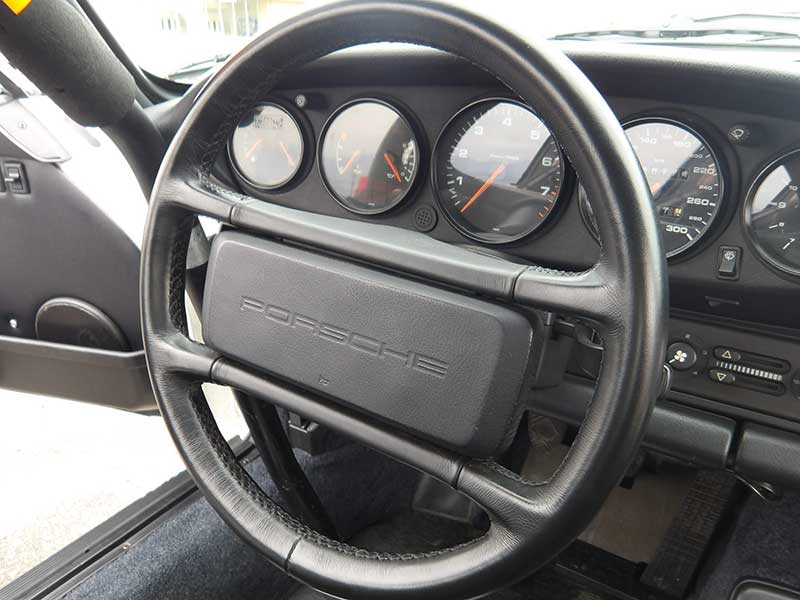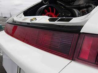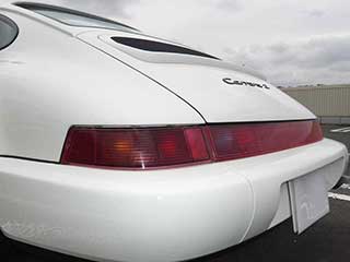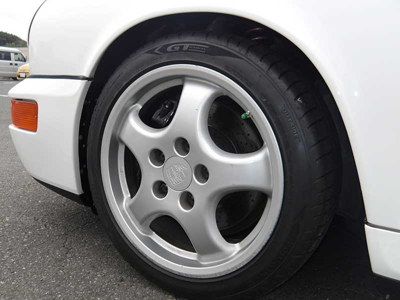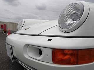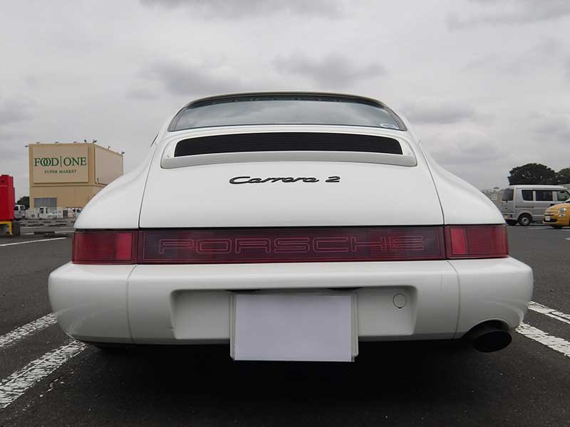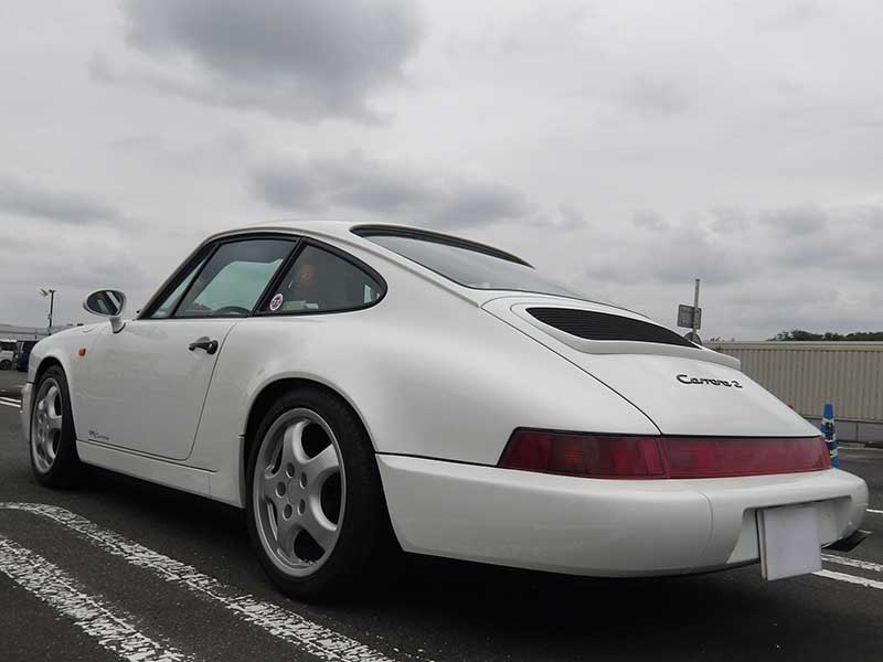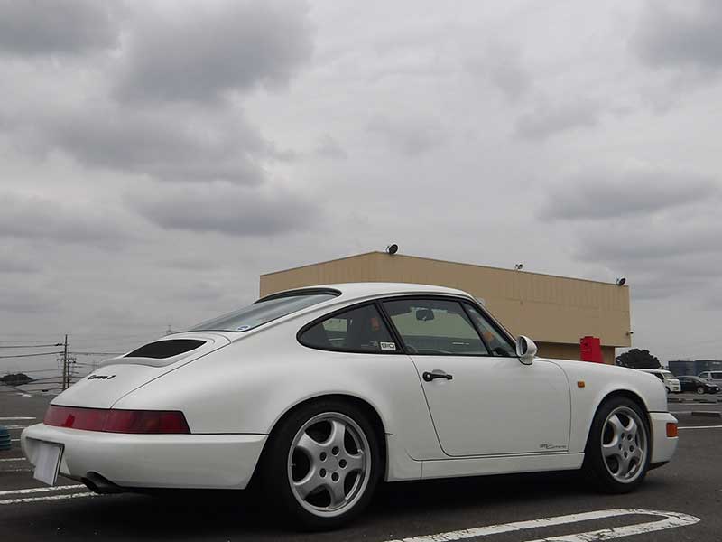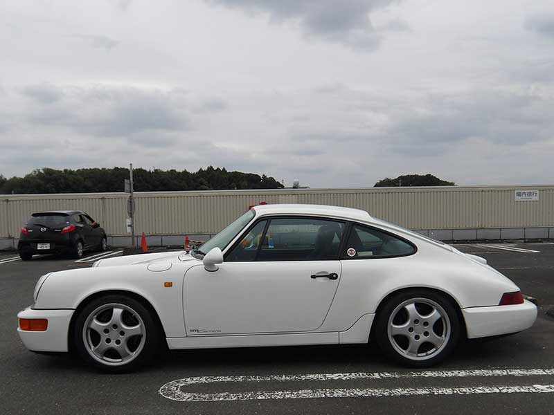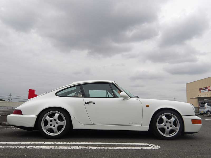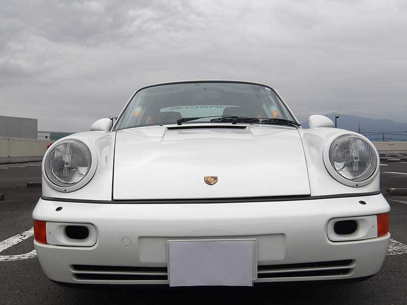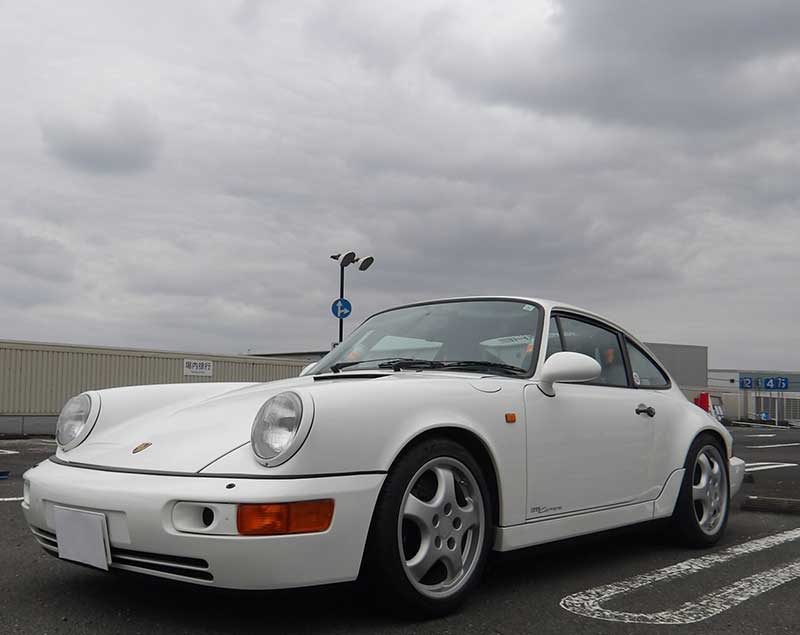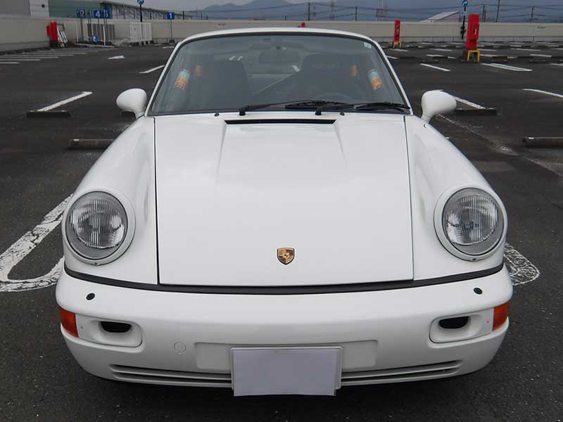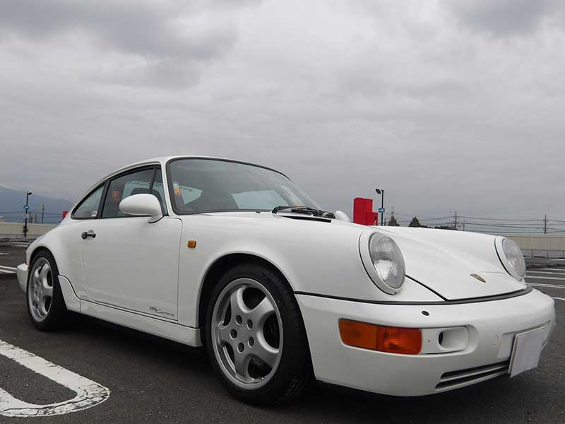★ポルシェ964に関して ポルシェ964は、1989年から1993年にかけて製造・販売されていた3代目モデルを指すコードネームである。 また、964は最後のセミトレーリング式リヤサスペンションとRRの組み合わせとなった。セミトレーリング式では対地キャンバーが崩れて接地限界は993以降のマルチリンク式に劣る。その一方で対地キャンバーが一定の割合で崩れていくので運転手がタイヤの接地情報を得られやすい美点もある。 当時の実験、開発部門がリヤサスペンション取り付け部を重点的にボディをチューニングすることで、創業時の356から伝統的に運転手を熱狂させてきた、独特のトラクション感を体験できる最後のポルシェが964であり、腕に覚えのある方に取っては、まさにサーキットマシンであった。 ◆当車について◆ 2010年に購入、1990年式 正規ディーラー車(ミツワ物)オーナー数不明、禁煙車、整備記録(新車時より現在まで)自宅駐車場保管(ボデイカバー)事故歴・修復歴不明、ETC、スペアキー1本 ※型式/E-964A、原動機の型式/62、車台番号/WPOZZZ96ZLS406●●● ◆エクステリア◆ 現オーナー様が購入される約4年前に色替え。今から約19年程前(シルバーから現在のホワイトへ) 一部に磨くと取れると思われる小傷と極小のエクボ(画像に写らない程度のもの)が見られました。 車両は全体を見回しても、一見変更箇所も気がつかない程オリジナルに忠実に拘りモデイファイされております。 外見上は、92年以降採用された後期型ホイール、流線型ミラー、フロントバンバーのダクト、ん!少しだけ下がった車高がオリジナルとは違うのかと思う程度です。 しかし、もう少し見てみると、リアマフラーの素材感(チタン)が違う。サブパイプもチタンでしっかりキャタライザーも装着され車検もクリアー出来る乾いた音質。 前に回りフロントフードを開閉すると、一見純正キャッチなのに1-2センチほど上げた瞬間に軽い!FRP製と気がつく。 フロントフードを開けると正面に90Lタンク、上部にカーボンタイプのタワーバー、バッテリーにはキルスイッチ、新しいバッテリーも付いている。当然、スペアータイヤ、純正工具も普通に積載されております。 フード内の細部の処理も非常に丁寧で、オーナー様のセンスを垣間見た瞬間です。 これはもしかしてブレーキ関連も変更されているのではと拝見したところ、ローターはドリルドタイプの964RSのデイスクローター(F.R)フロントキャリパーは、ターボ3.6用の物。リアキャリパーは993、タイロッド(タイロッドエンド)も993、足回りはクアンタム製(街乗りもこなせるようバネレートは8k以下)LSDも装着されております。 17インチのホイールには、レグノ F 215/45R17 R 245/40R17 新しいタイヤが9.5部山。 フロントのアルミ製アップライト等、その他エンジン、内装はどうなっているのだろうかと益々興味の沸く所でインテリアに続きます、、、 ◆インテリア◆ 乗り込んだ瞬間、お〜 綺麗にパッドの巻かれた、マター製の6点式ロールケイジ(標準の仕様のマターはサイドバーが無いので乗り降りしやすい) 運転席側はレカロのフルバケ(純正シートあり)その為、車検証上は2名乗車公認。また、助手席に見慣れたものが、、aprのモニターです。現在この964はaprのホットワイヤーが装着されております。普段はシート下に入れております(ノーマルあり) 室内は清潔感がありとても綺麗な状態です。ダッシュボート(ヒビ、亀裂も無く、当時の素材感そのままに感じられる)助手席純正シート状態良し。 運転席側フロアーはオーナー様の好みでカーペットレス仕様(取り外したカーペットマットあり)ドライビングに集中できるようフットパネル製作。 メーター関連も気になる傷、汚れ、曇りも無く良好。オーデイオは社外CD、ラジオ。 さあ、シートに座って見ます。ん!なんか違う。オーナー様が特注加工された純正ステアリングです。オリジナルは約36.5パイサイズなのですが握った感じ少し小さく感じます。聞きました所、ステアリング本体の鉄芯は一切加工せず、表皮をまき直して36パイに変更されております。同時に僅かにオフセットさせる為にオリジナルスペーサーまで追加。 エアコンも現在のガスに対応仕様。とても良く効きます。半面、1つ告知したいところが温風です。964の持病の一つ、A/Cコントロールユニットの問題で20℃以上の温風が出ません。これが唯一の不具合箇所です。パーツの供給はまだされておりますのでご心配なく。 両ドア内は軽量で簡素化されたなRSタイプの物に変更されており、ドアの開閉は赤いベルトを引く定番のもの。 ドアのタレも無く、カチンと締まりも良好。ロールケイジの恩恵で、車体全体の塊感は非常に高いもので低速でも気になるきしみ音などは感じませんでした。 ◆エンジン・整備関連◆ 1990年新車登録時からの記録簿あり。基本、ディーラー(ミツワ、ポルシェセンター)空冷を得意とされる専門店にて整備されてきた個体となります。適時アップデートされており、現在機関系