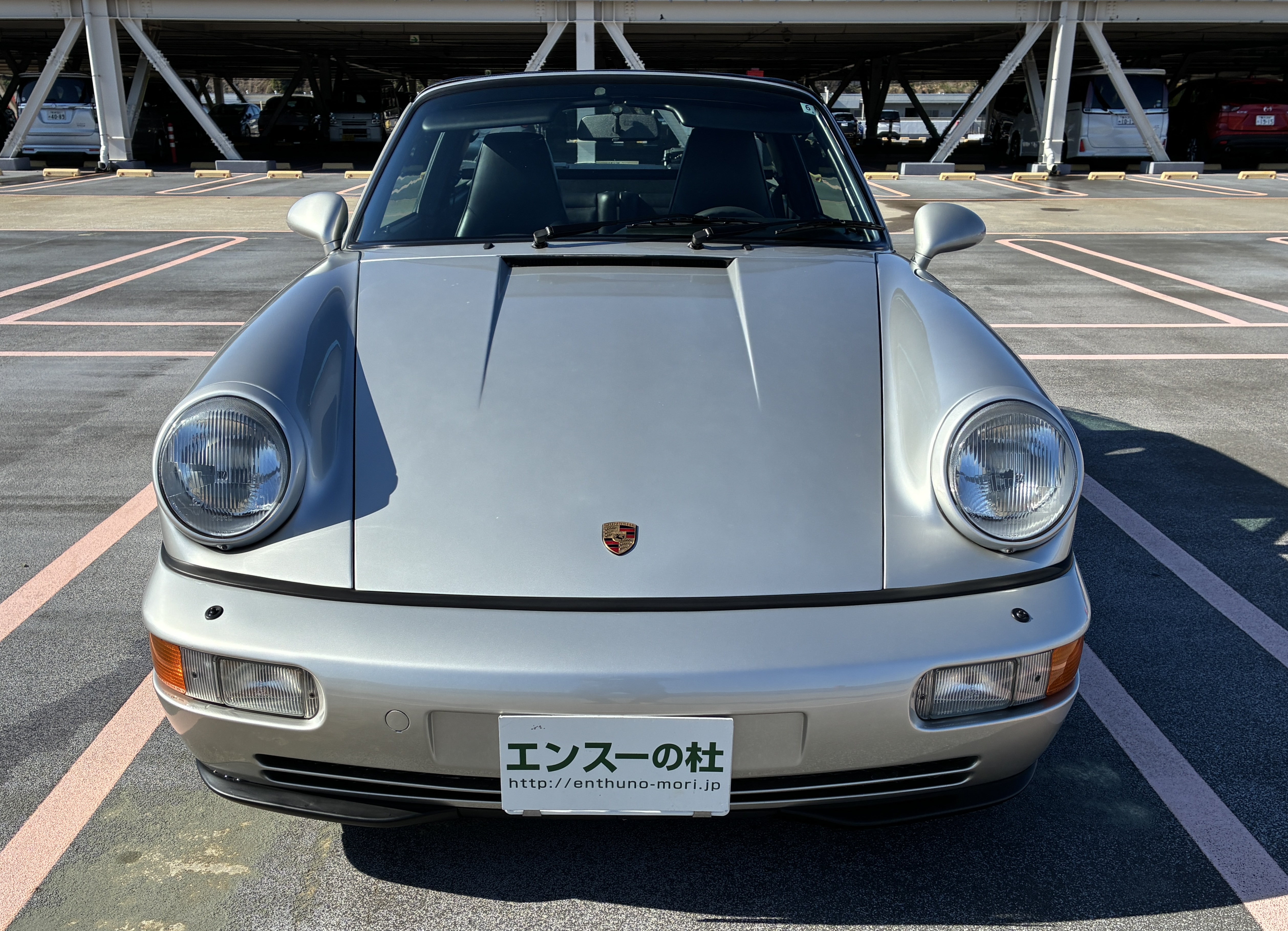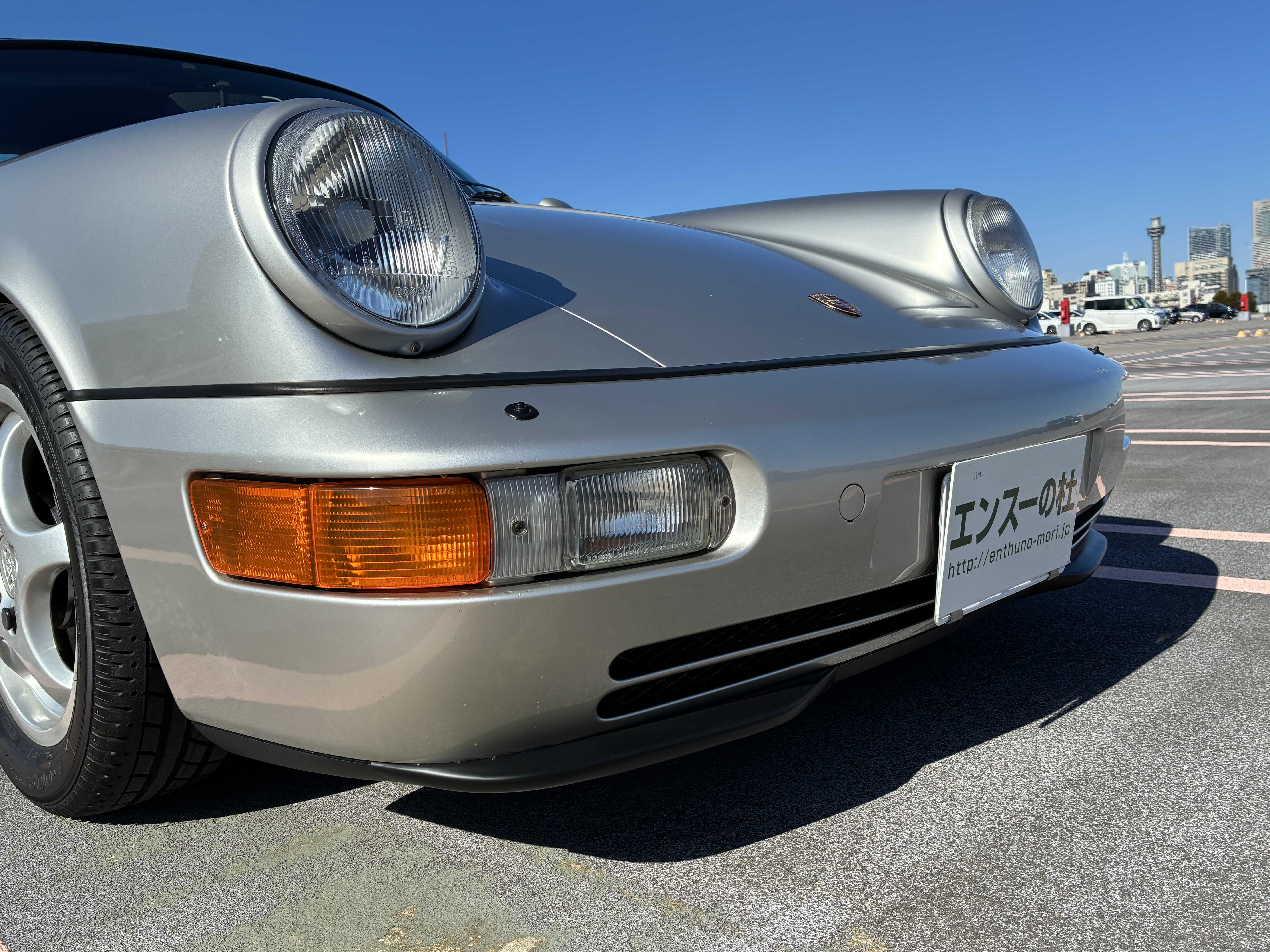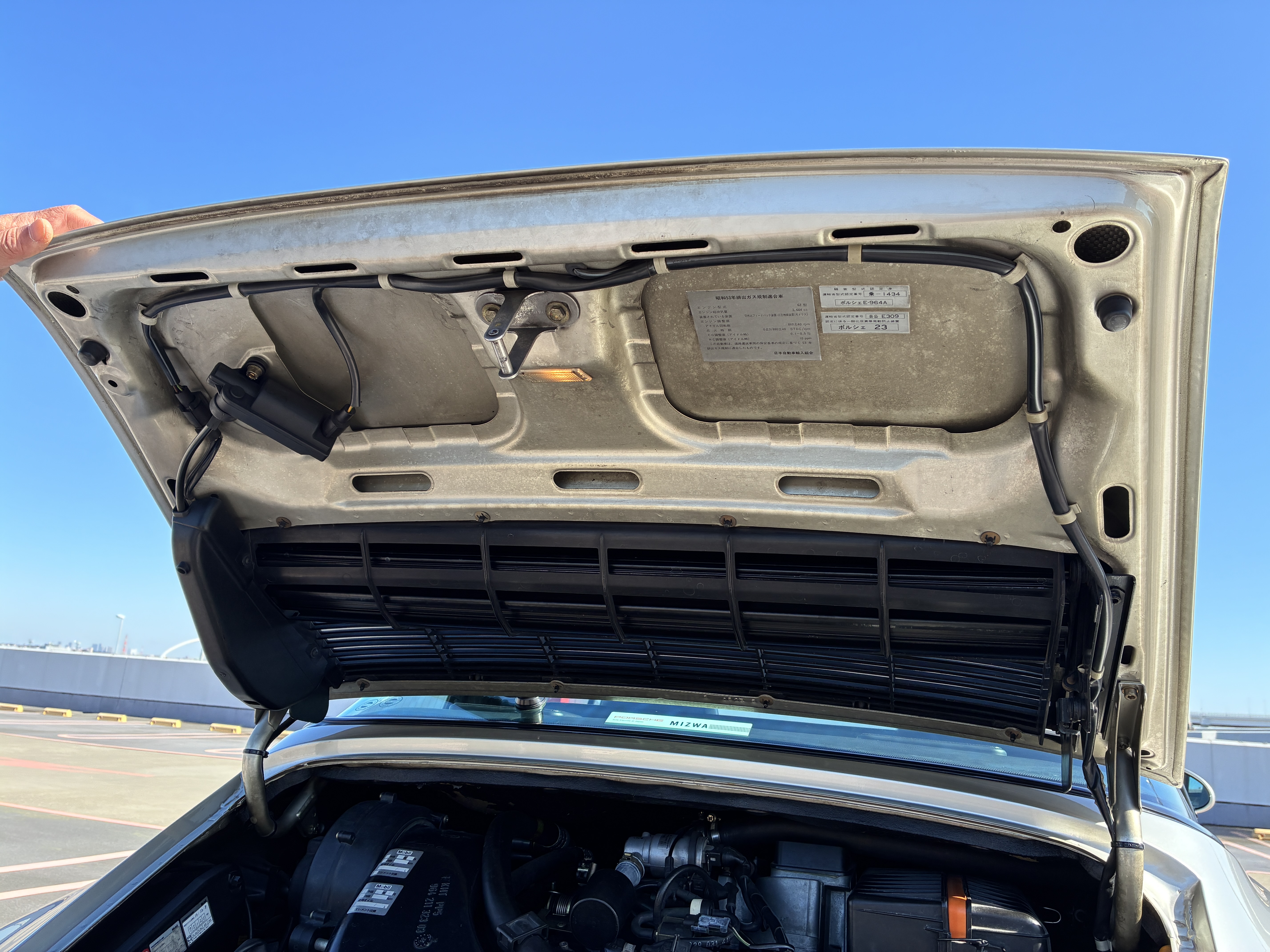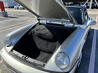 964 RS 3.8タイプのフロントリップスポイラー(社外品)・純正フロントストラットタワーバー・リアピラーバー(カワイ製作所)を装着し、空力・ボディー剛性と高めています。 ヘッドライトはLED球に交換しています。