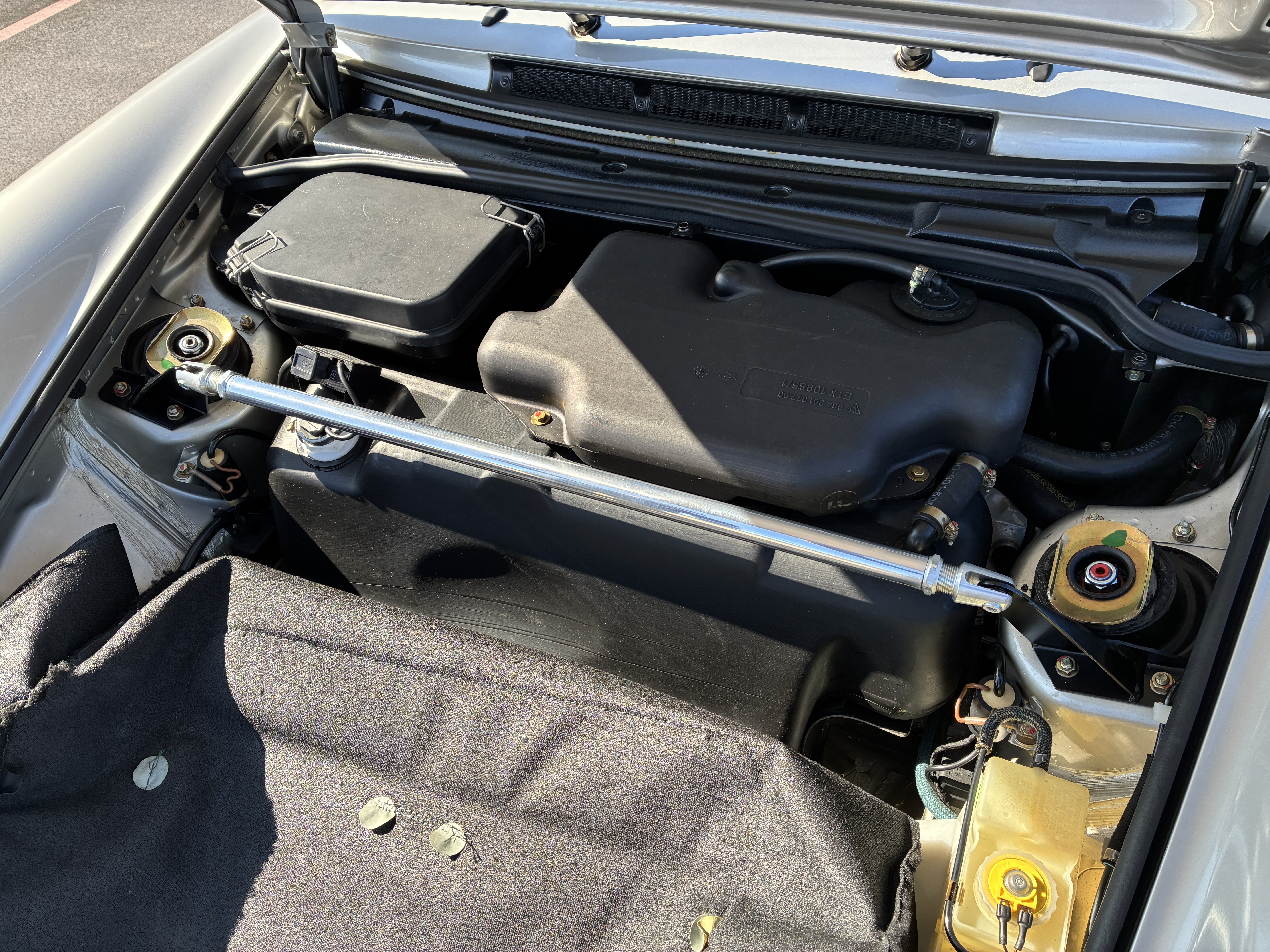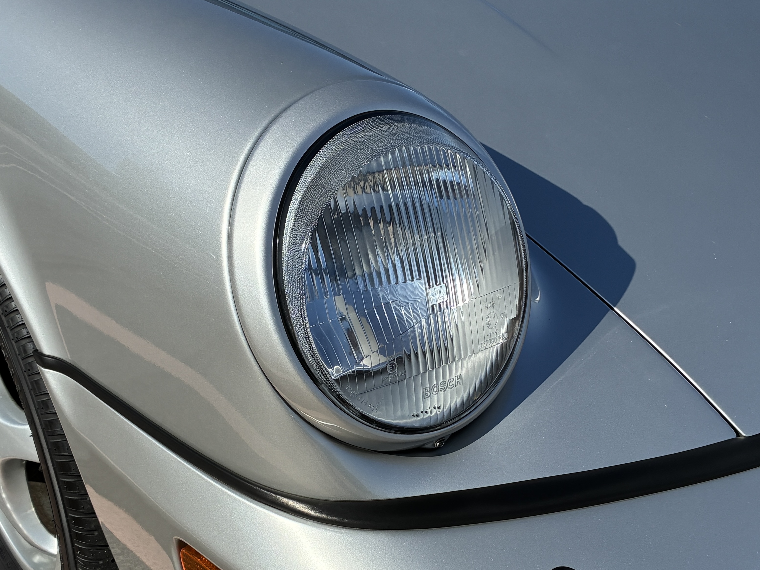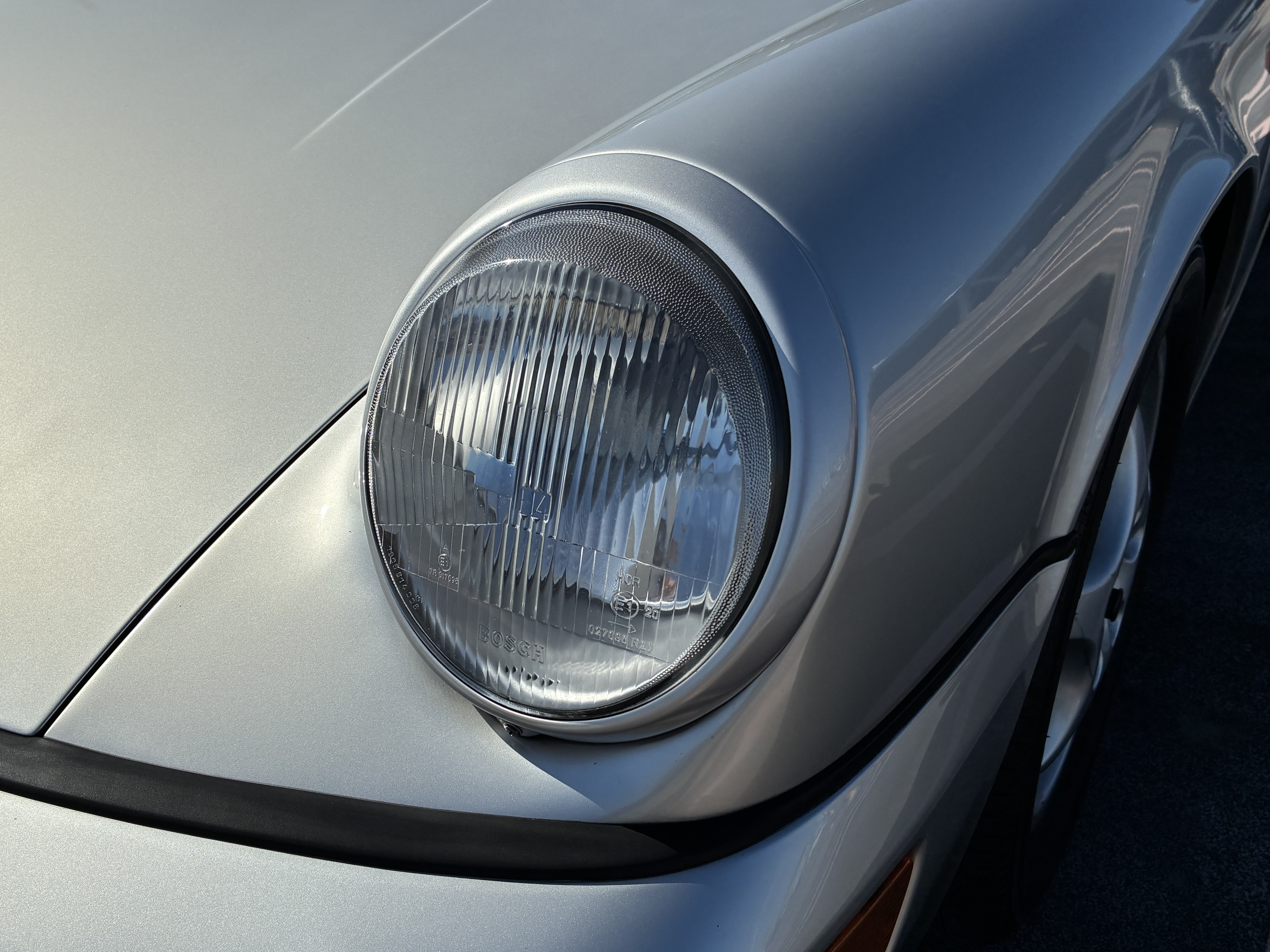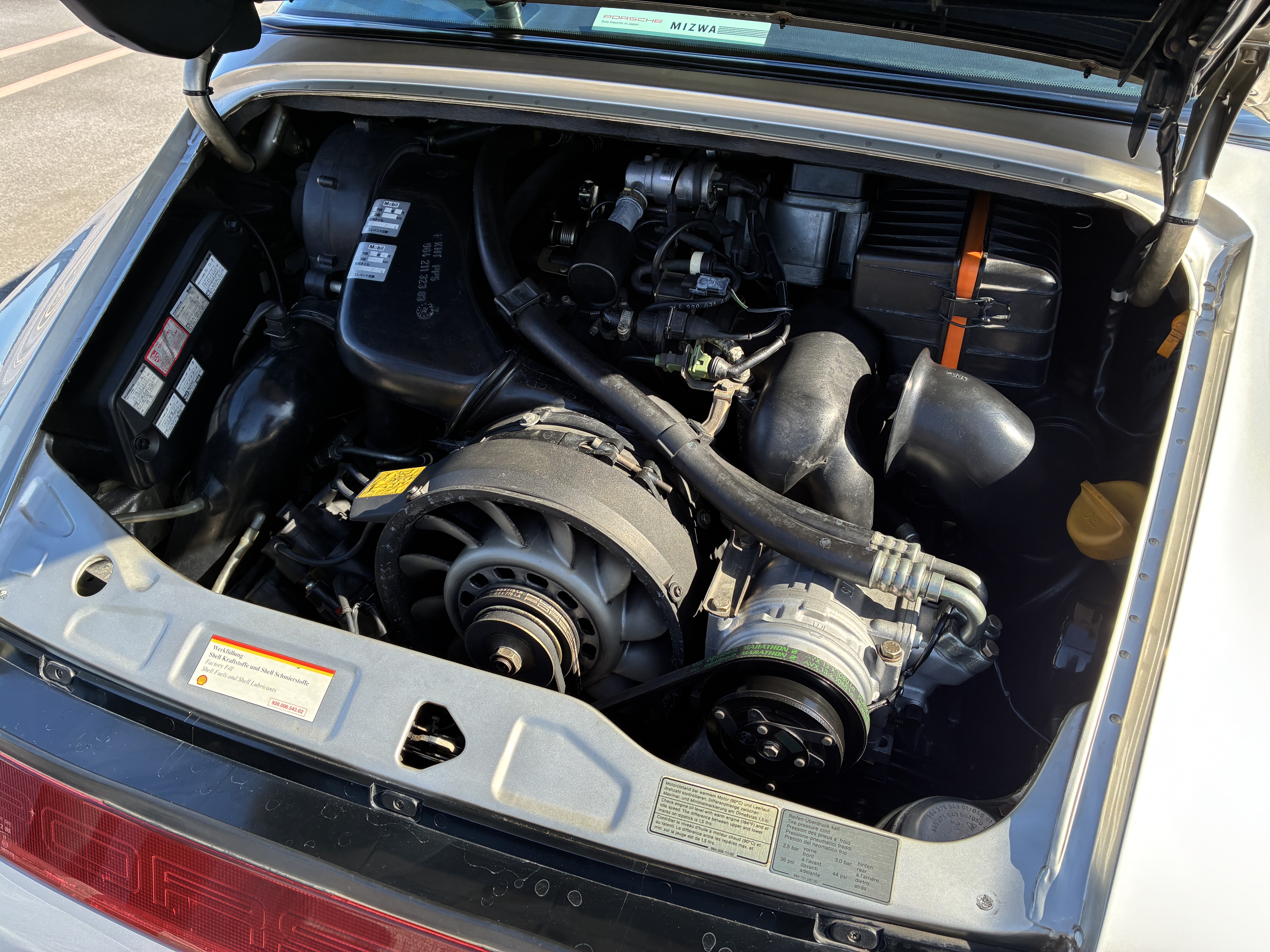 964 RS 3.8タイプのフロントリップスポイラー(社外品)・純正フロントストラットタワーバー・リアピラーバー(カワイ製作所)を装着し、空力・ボディー剛性と高めています。 ヘッドライトはLED球に交換しています。