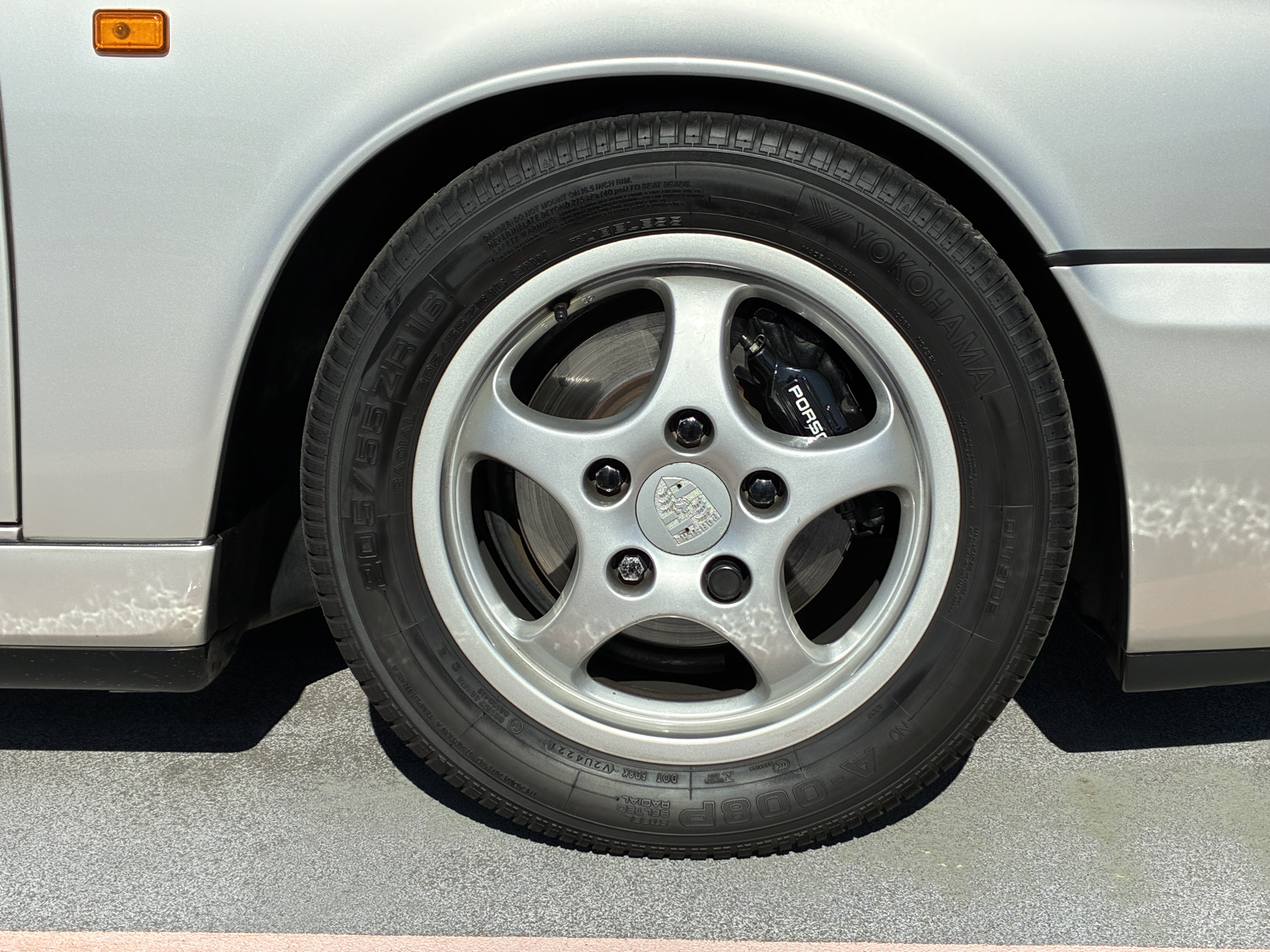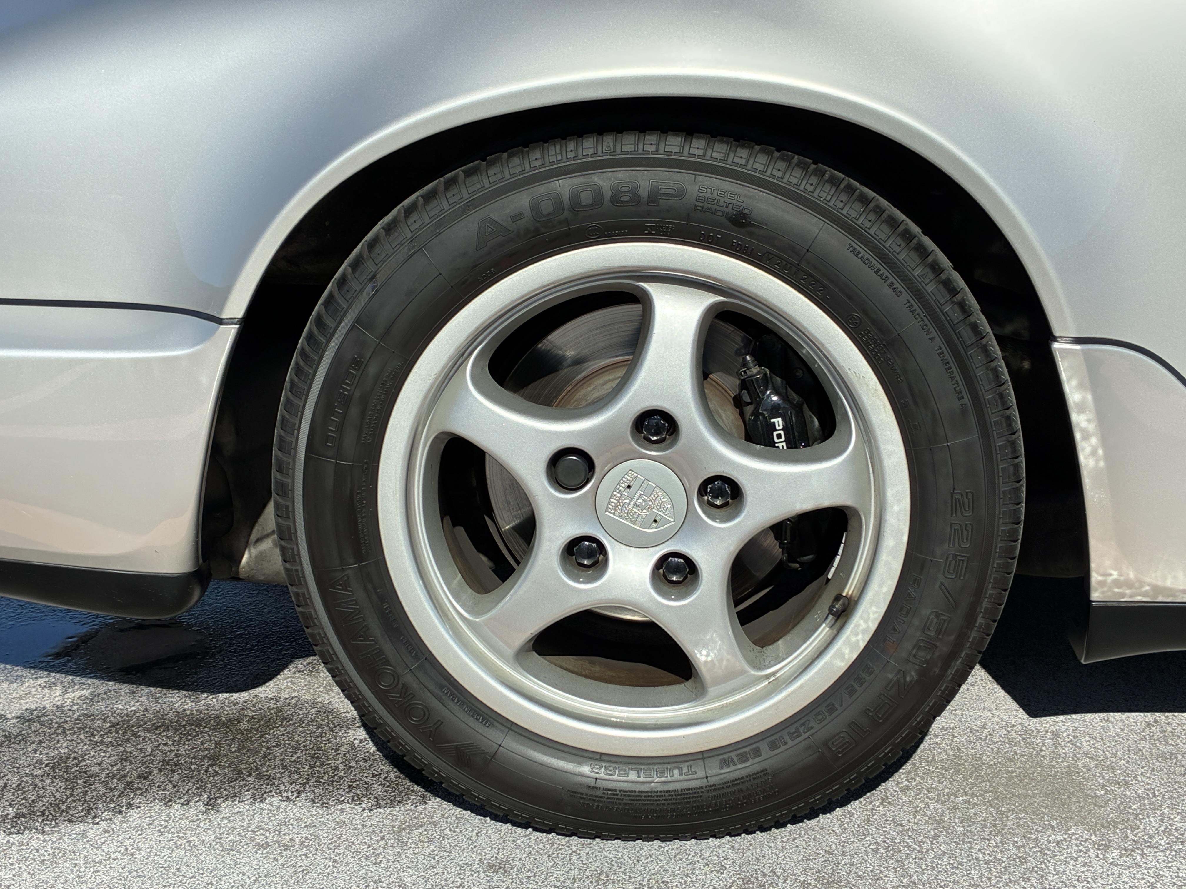 ホイールは純正16インチアルミホイールで、タイヤは2021後半から2022年前半に製造された YOKOHAMA A-008P で、タイヤはフロントが205/55ZR16・リアが225/50ZR16、山は5分山程度残っています。
